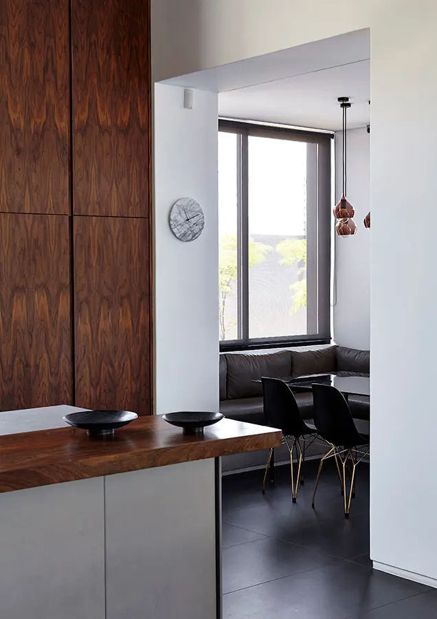 “Realmente tienes un uso intencional y claro de materiales”, dice Enrico. Mientras el concreto a la vista es contrastado con madera y vidrio en la mayoría de los ambientes, en el caso del baño de huéspedes la capa de cobre es restringida y cuidadosamente modulada. “Tienes que estar atento al tener muchas capas o materiales. Si juegas con más de tres o cuatro, estás en riesgo de crear un caos”. En esta casa, por ejemplo, las formas reducidas, como la isla de la cocina, evitan que el lugar se vea sobrecargado.