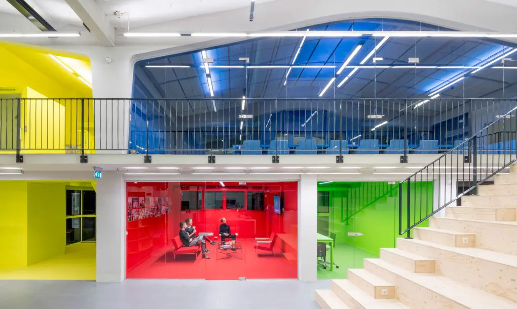 El espacio central es ligero y silencioso, una pared de cristal, cubierta de garabatos y diagramas de trabajo, separa el taller de la sala de estar. Salas de múltiples colores llamativos sirven para reuniones, cada una tiene un tema y mobiliario especifico.