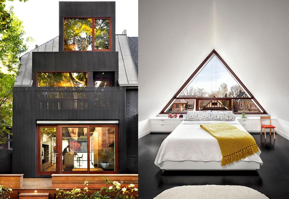 Una ventana triangular expansiva, con vista al centro de la cuidad, sustituyó la estructura tradicional original, las cortinas se hicieron a la medida y cuando no esta en uso, una unidad personalizada en carpintería la retrae.