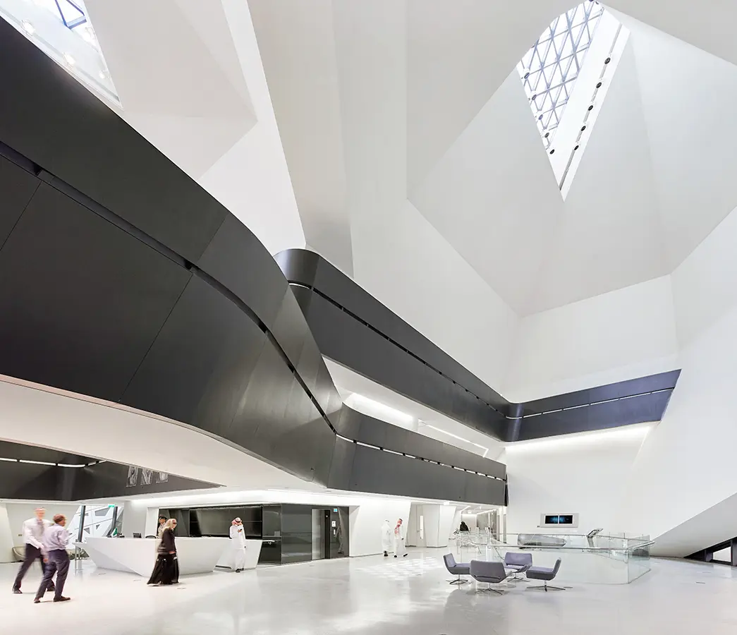 Con su caparazón fuerte en el exterior que protege contra los extremos del clima, la arquitectura de KAPSARC es porosa en su interior. Células hexagonales específicas, estratégicamente ubicadas dentro de cada edificio se dejan abiertas para crear una serie de patios protegidos que llevan la luz del día suavemente controlada al interior.