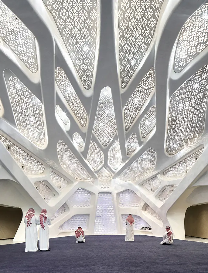 Las estructuras de nido de abeja prismáticas hexagonales utilizan el menor material posible para crear una red de celdas dentro de un volumen dado. Este principio estructural y organizacional determinó la composición de diseño como una amalgama de formas cristalinas que surge del paisaje desértico, evolucionando para responder mejor a las condiciones ambientales y los requisitos internos del programa. La rejilla de panal se comprime hacia su eje central como una extensión del wadi natural que corre hacia el oeste.