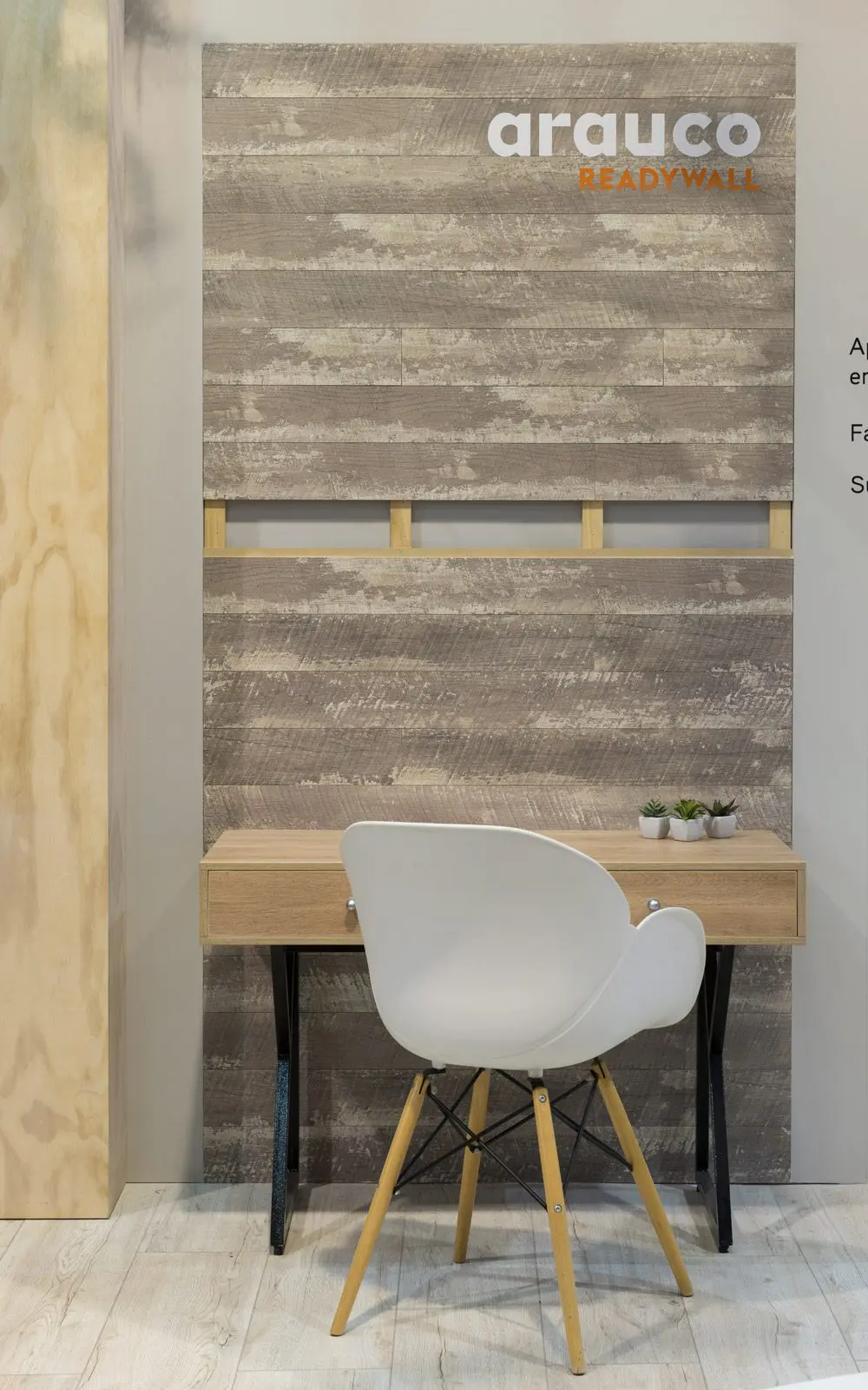 Arauco ReadyWall es un sistema de revestimiento decorativo con piezas –recubiertas de papel melamínico– de 122 centímetros de largo por 133 de ancho y 12 milímetros de espesor. La unidad de empaque es de 8 piezas por caja y cubre un área de 1,10 metros cuadrados. Se pueden usar de manera horizontal o vertical para remodelar cualquier lugar de la casa. Este concepto busca invitar a explorar nuevas posibilidades de una manera fácil y práctica.