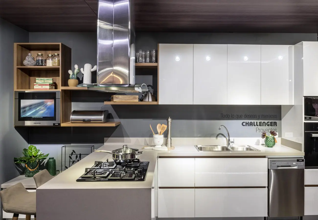 Challenger no solo vende electrodomésticos; desde hace 40 años ha transformado aglomerados cubiertos con melamina para su canal de construcción. Su incursión en la carpintería arquitectónica abre un abanico de opciones: es posible encontrar cocinas VIP en las que combinan tendencias de alto brillo y un portafolio exclusivo con una campana de isla, hornos, refrigeración y lavavajillas; también ofrecen estilos para hogares de interés social con mesones de acero. Para estudiantes o aquellos que empiezan a encontrar su lugar en espacios reducidos –de 25 a 35 metros cuadrados– crearon una propuesta que permite tener clóset, cocina, comedor y lavandería con puertas corredizas para aprovechar cada centímetro.