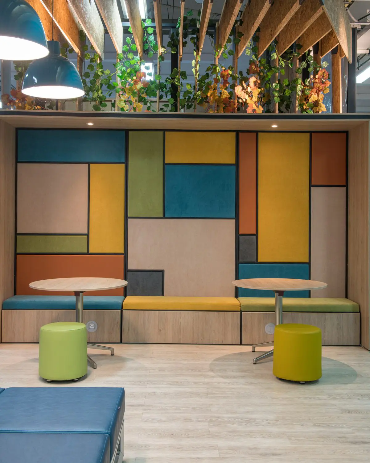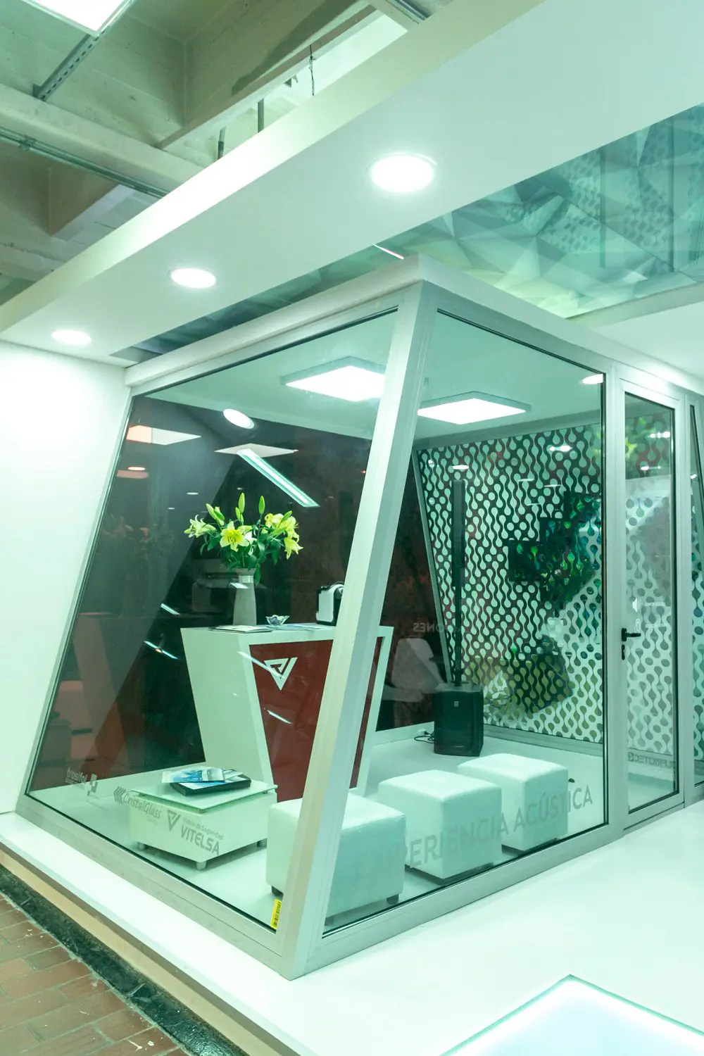 También creó la sala Emix y cabinas de trabajo que son perfectas para reuniones. La primera cuenta con acondicionamiento acústico y fue dotada con sofás fabricados en tablero aglomerado y espuma de poliuretano, tapizados con paño tipo poliéster. Las cabinas estaban estructuradas en forma de cubo y fueron hechas en tablero aglomerado: además cuentan con vidrio templado de 10 mm de espesor.