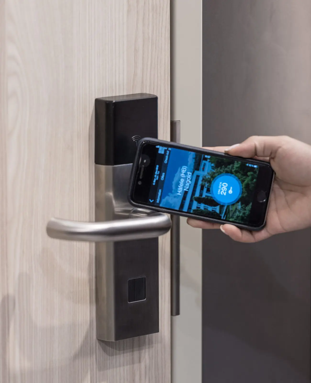 Häfele presentó su innovadora puerta hotelera que se maneja a través del celular: el usuario puede hacer su reserva, check-in y check-out sin necesidad de tener una tarjeta. Esto quiere decir que la recepción pasa a un segundo plano. La persona puede llegar al complejo y acceder al ascensor y a su cuarto, sin anunciarse.