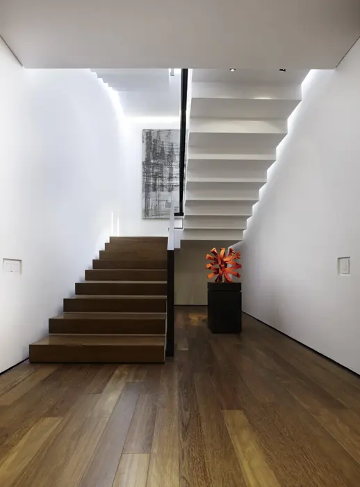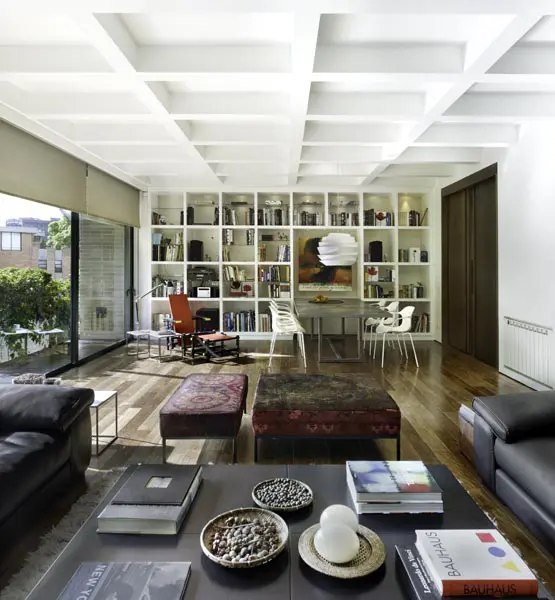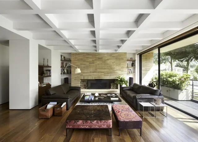 El primer piso está reservado para la recreación y el uso de la comunidad. Allí tienen su espacio la piscina, la biblioteca y un cine, entre otros espacios articulados en torno de una calle interior que se convierte en un lugar de encuentro para los residentes del conjunto. El juego entre la sobriedad del diseño y la riqueza de sus posibilidades de adaptación a distintos gustos y preferencias se aprecia en una de las casas, a la que se entra por un nivel intermedio donde se encuentra la zona social, con la sala y el comedor, y el área de servicios.