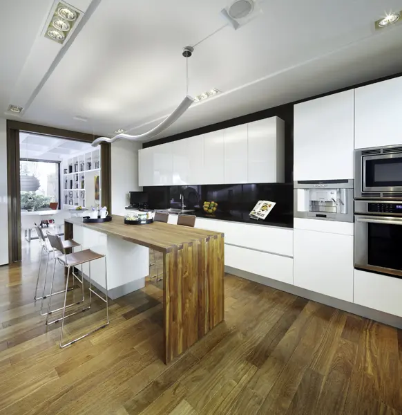 La madera marca el tono y la calidez de los acabados, y se usa en una gran variedad de aplicaciones: en los pisos, en la plataforma de la ducha doble del baño principal o en el mesón de teca de la cocina.