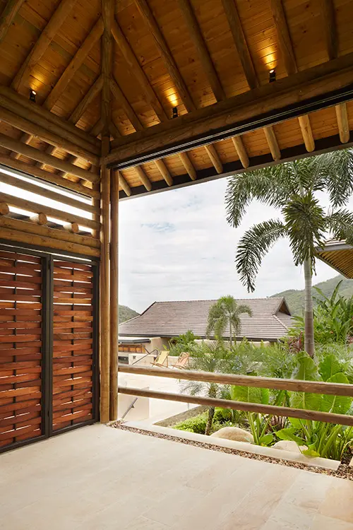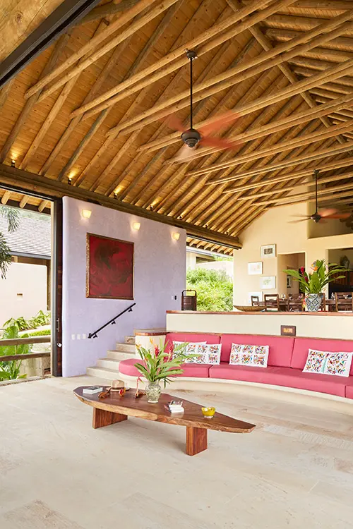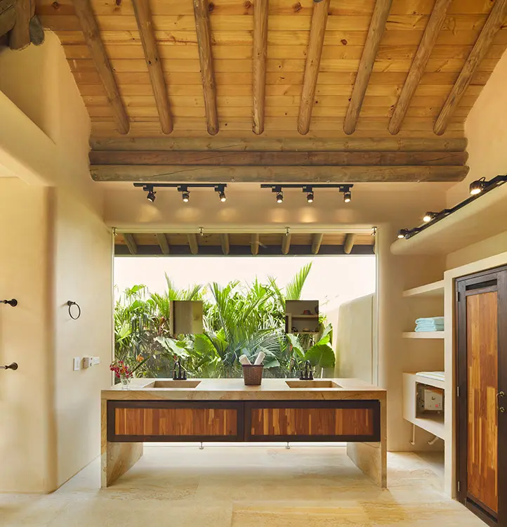 Así mismo, el aire fluye libremente a través del espacio social, refrescándolo y manteniendo una temperatura agradable hasta en los días más calurosos. Gracias a esta propuesta de ventilación, sumada a la generosa altura, al efecto de la cubierta inclinada, a las aperturas estratégicamente ubicadas en su parte superior, a los amplios vanos y a la constante presencia de vegetación y agua en toda la casa, se puede prescindir del aire acondicionado sin sacrificar bienestar y confort, lo que la convierte en un oasis.