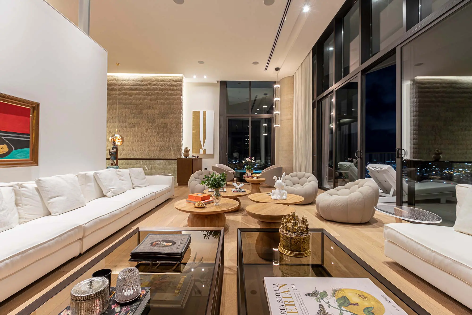 En este apartamento en Cartagena (Bolívar), localizado en los pisos 29 y 30 de una nueva torre ubicada sobre la bahía de la ciudad, lo doméstico y lo monumental no siempre están ligados; en esta oportunidad, aparecen como características espaciales complementarias que coexisten para la vivencia y disfrute de sus habitantes, generando espacios que expresan unidad, recogimiento y armonía.