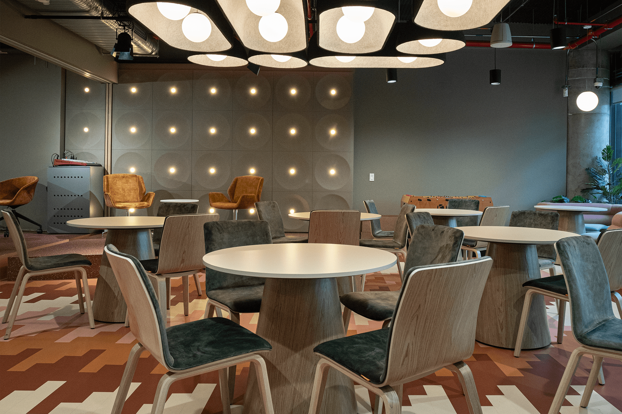 En el proyecto, en general, priorizaron la biofilia, al igual que el uso de materiales nobles y no tóxicos para reducir la huella de carbono. Así mismo, en las zonas de encuentro de las tres oficinas, como el auditorio, utilizaron paneles acústicos e iluminación cálida, para componer entornos más confortables.
