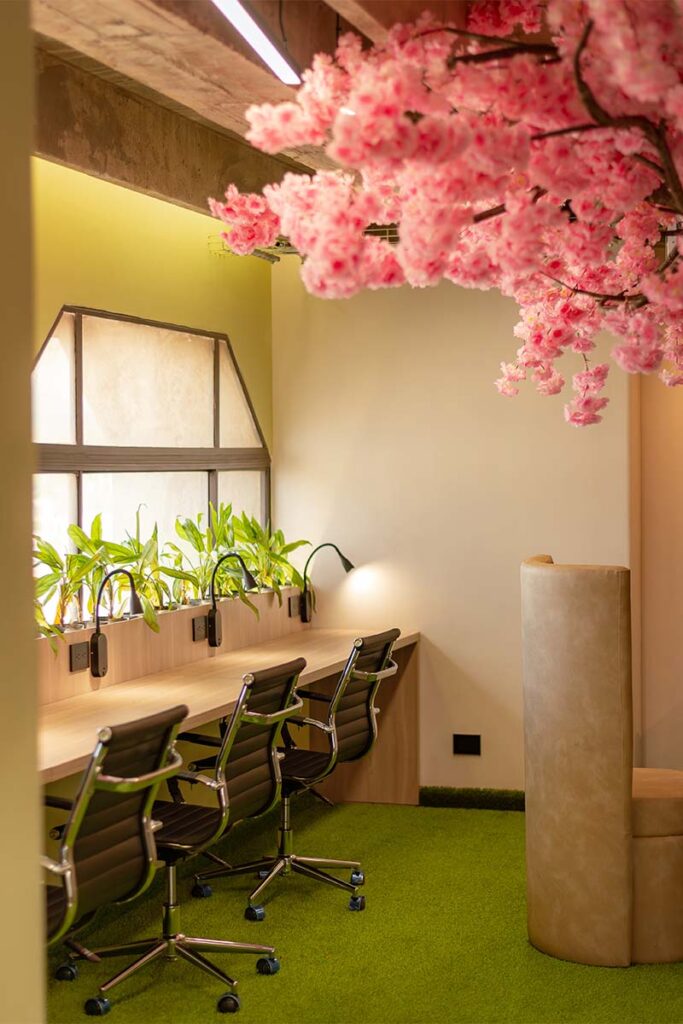 En cuanto a los acabados, se destaca el uso de grama sintética para el revestimiento del piso en determinadas áreas y de melamina tipo roble en el módulo de reuniones, cuyas vetas transmiten la esencia natural de la madera.