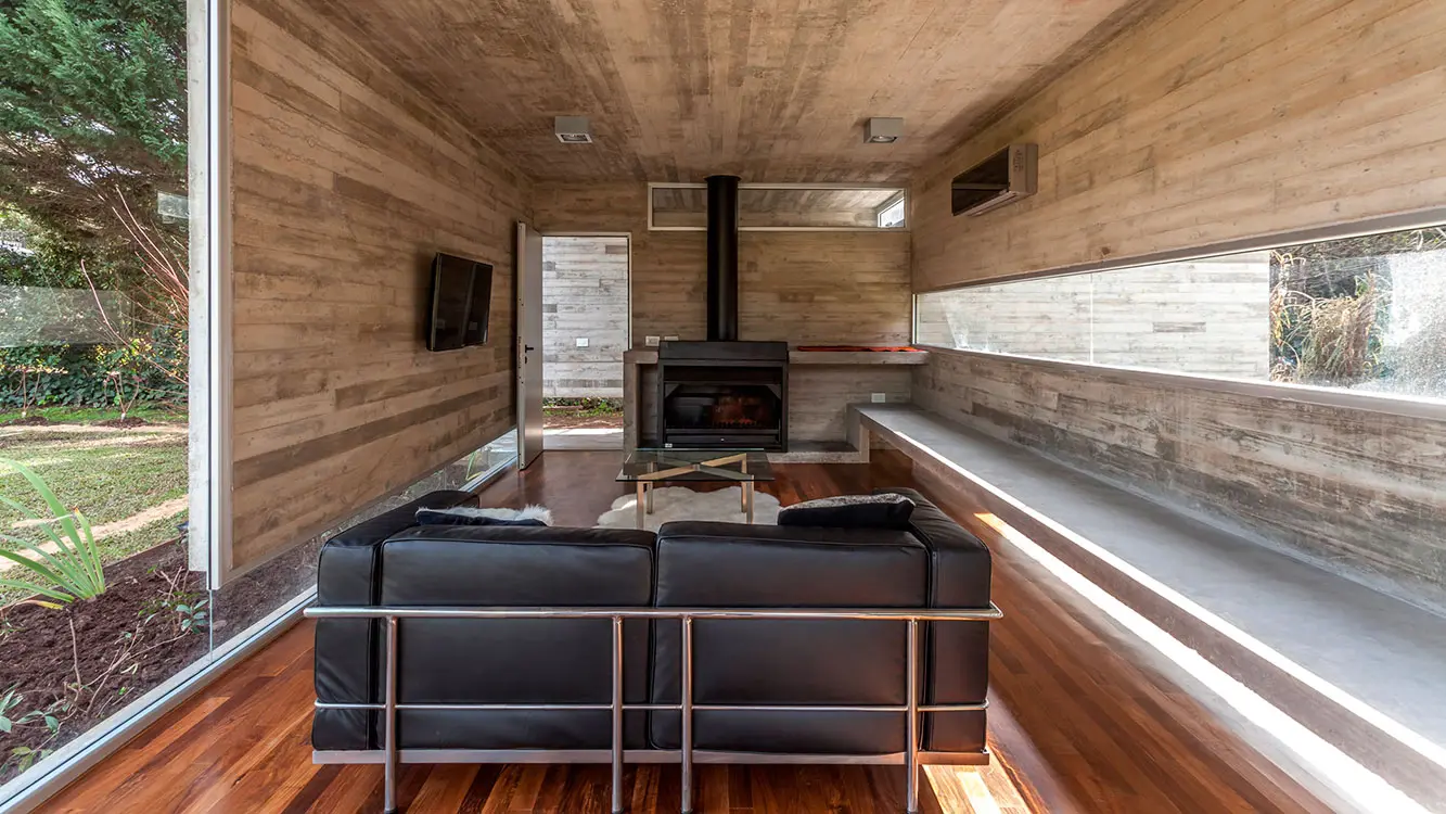 Dentro de la propiedad, y en el sector más alejado de la vivienda se encuentra este refugio de 45m2 + piscina, en concreto, vidrio y madera.