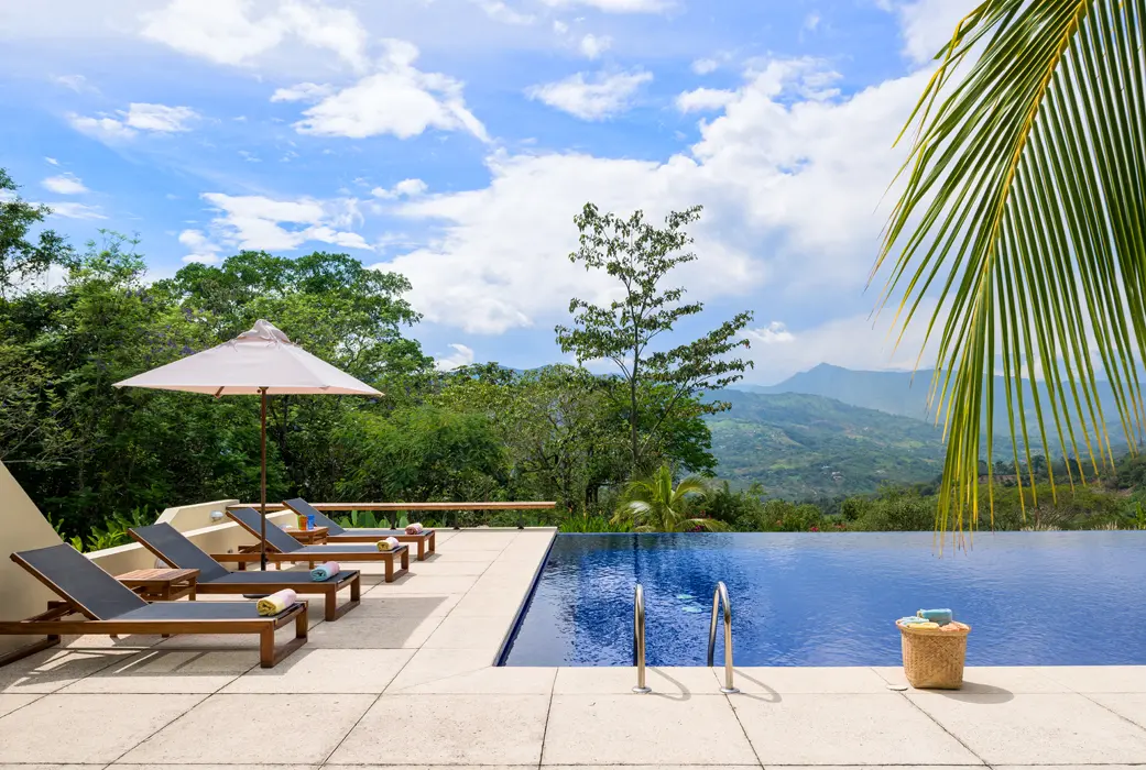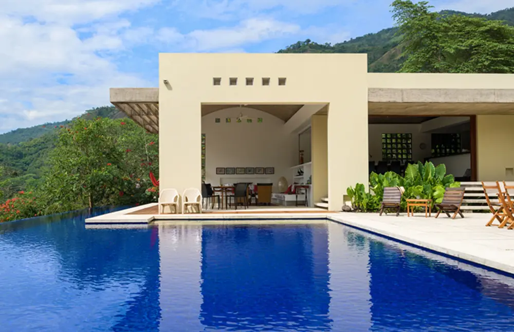 Para el diseño de esta vivienda, de 400 metros cuadrados, optaron por un volumen en forma de “U”. En un lado ubicaron la sala, el comedor y la cocina; en el otro, el acceso, dos habitaciones y el estar de alcobas; opuesto a la zona social, dos cuartos más y el dormitorio principal, todo planteado alrededor de un espacio central en el cual están la piscina, con una zona para descansar y un carril de 20 metros para nadar, y una terraza con mesas y parasoles.
