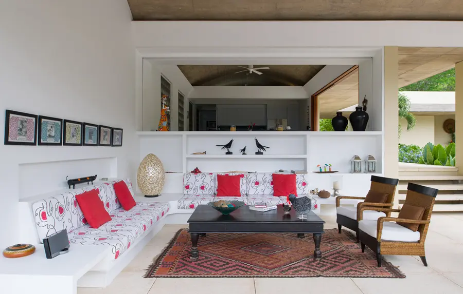 Dada la inclinación del terreno, la sala tiene una mayor altura para generar un espacio fresco, luminoso y con gran vista. Los muebles de mampostería responden a una cuestión de seguridad, pues la vivienda permanece siempre abierta, solo el comedor tiene puertas corredizas de madera para aislarlo. La iluminación, diseño del arquitecto, es indirecta y proyectada sobre las bóvedas; el resto es solucionado con lámparas de mesa y de piso.