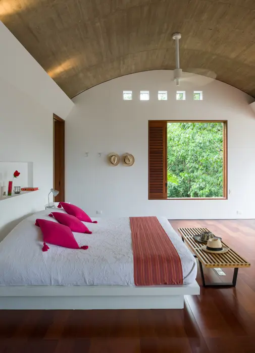 Las cubiertas de los cuartos son dos bóvedas de concreto a la vista, lo que permitió una mezcla de materiales que genera espacios cálidos, sencillos y austeros. Vista la vivienda desde el exterior, las bóvedas de cinco metros de ancho son imperceptibles pues están escondidas entre muros, pero desde el interior funcionan como cubiertas y son protagonistas. Solo la zona de acceso y las circulaciones cuentan con una cubierta plana y una placa de concreto expuesta, lo cual las resalta aun con mayor fuerza.
