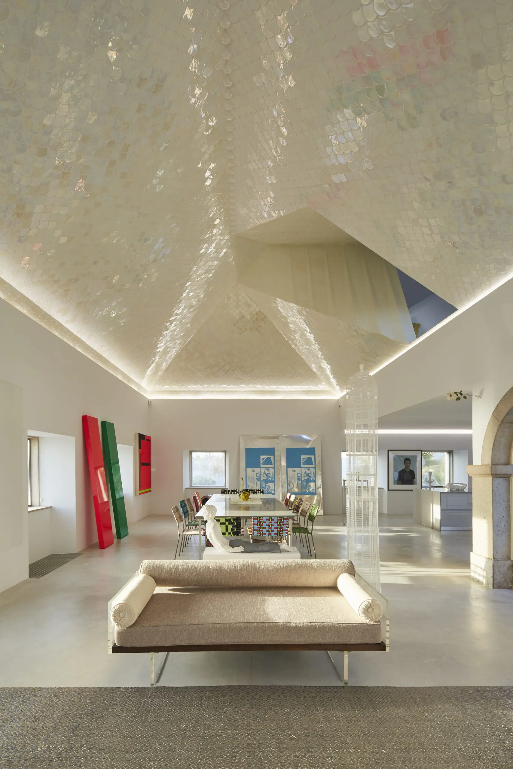 En la búsqueda de una solución a este inconveniente llegaron a la propuesta de enchapar el techo en azulejos –fabricados especialmente para este proyecto–. “Queríamos suavizarlo para que fuera el hilo conductor de la casa. Así nació la idea de las escamas de pescado, y que los cerramientos de las habitaciones en el segundo piso hicieran alusión a las aletas”. Esta, podría decirse, es la pièce de résistance del proyecto, que no solo unifica los diversos ambientes, sino que compite con la impresionante colección de arte que alberga la casa.
