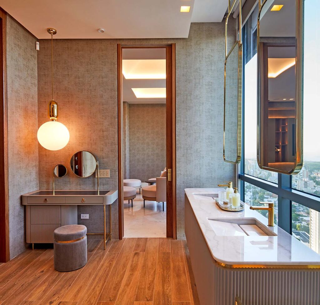 Sueltos en medio de un espacio amplio y generoso, el lavamanos y el tocador componen un frente al continuo ventanal que diluye el límite entre interior y exterior y los integra de manera permanente.