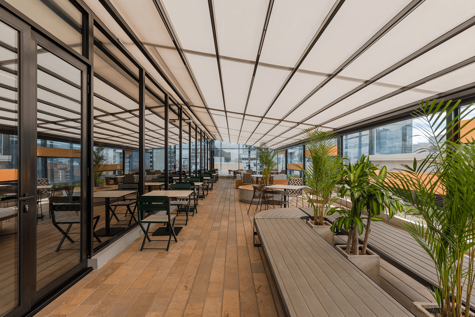 Para adecuar este lugar, destinado a zona de estar/comedor, optaron por la pérgola retráctil Pergotek Classic, de la compañía Parasoles Tropicales. Esta cuenta con una estructura en perfiles de aluminio extruido, que se pueden pintar según los requerimientos del proyecto.