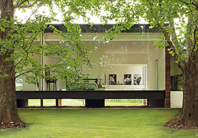 Imagínese vivir en un gran escenario. En lugar de público, un bosque de plátanos. En vez de telón, paneles de vidrio que recorren los laterales. La sensación de estar en un teatro es la que genera esta casa que fue construida en el condominio del Club de Golf Lago Azul, en el interior de San Pablo, por el arquitecto Marco Peres, de 48 años, para que fuera su vivienda.