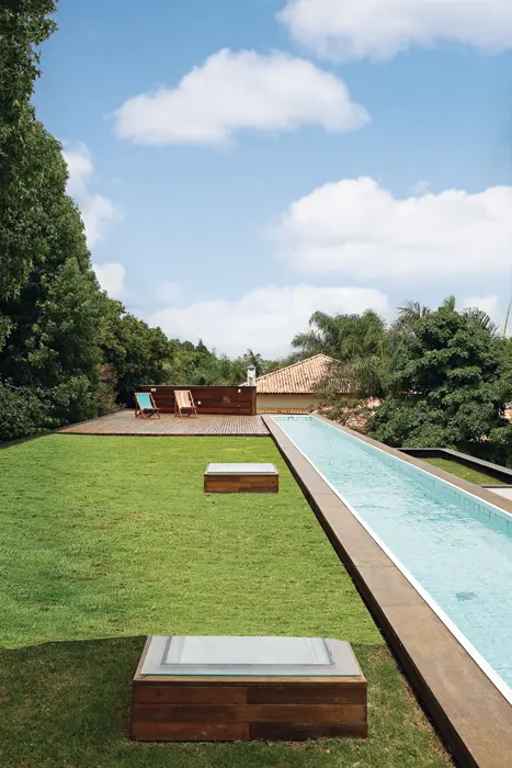 En la fachada del frente, cerrada por un panel de listones de madera de itaúba, se destaca un volumen blanco ocupado por la cocina. Esta zona está separada del la sala por una mesa de madera de pequiá construida por el diseñador Pedro Petty. De él también son los pufs y el banco del deck de la parrilla ubicada en la parte posterior del jardín. “Es una tradición gaucha que no podía faltar aquí», asegura.