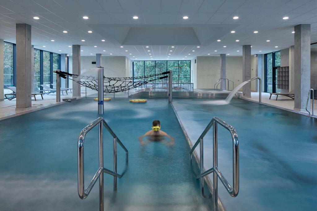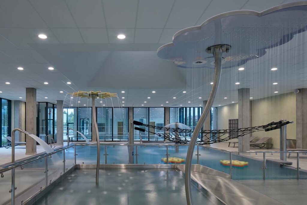 La cámara de la piscina cubierta se divide en tres partes principales: piscina, piscina de aventuras y bienestar. La piscina principal tiene cinco carriles con una longitud de 25 metros. La experiencia de la piscina cuenta con bancos con chorros de masaje, chorros de piscina y un tobogán de agua.