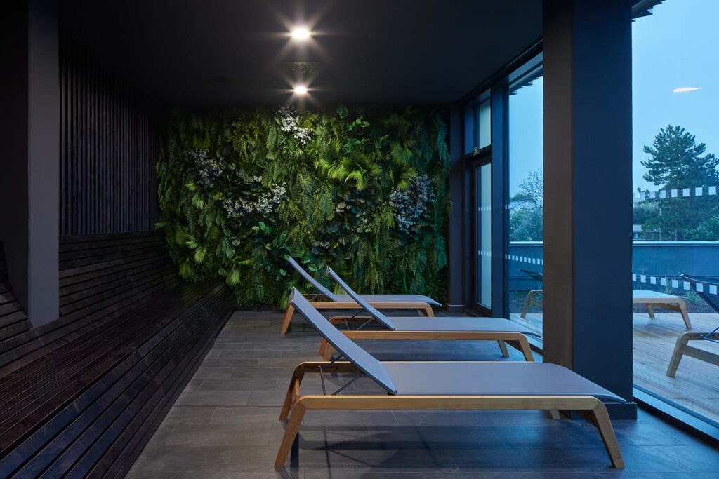 En la zona de bienestar hay cinco saunas: tropical, salada, aromática, baño de vapor turco y sauna ceremonial finlandesa con vistas a la piscina al aire libre. Todas las saunas son de diferentes tamaños y temperaturas y están construidas para crear una sensación de intimidad.