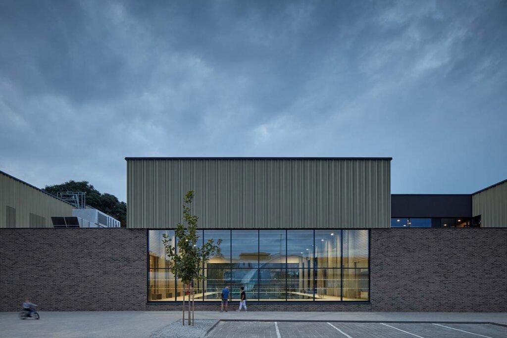 La fachada se suaviza revestirla con listones de ladrillo y chapa perforada de color dorado. Todo esto está respaldado por vistas a través del edificio, que conectan visualmente el área de la piscina al aire libre con el patio de este espacio.