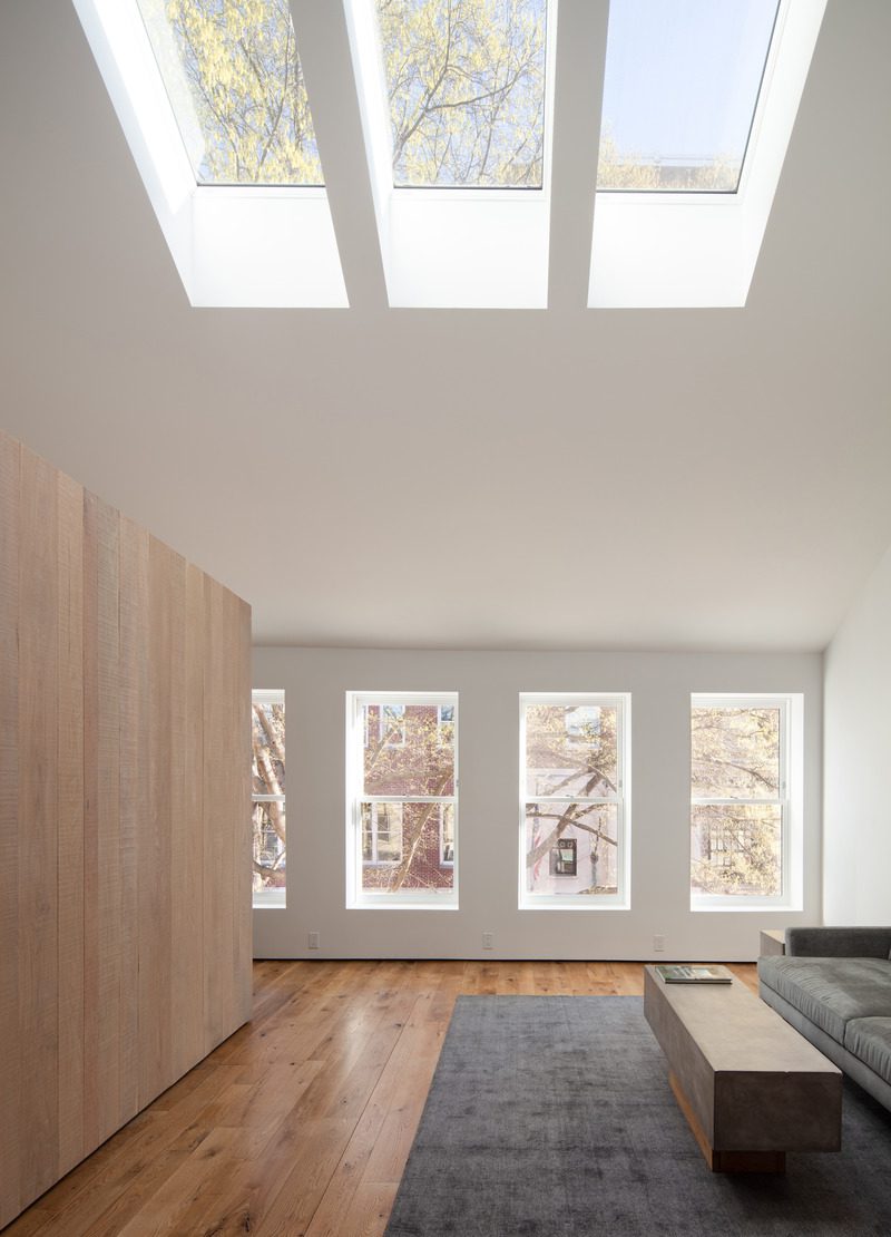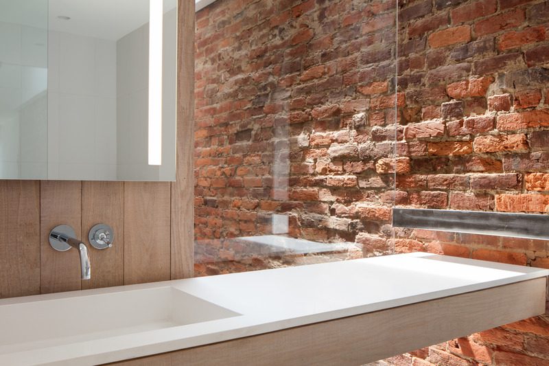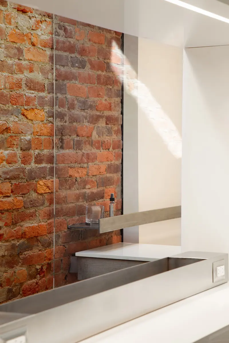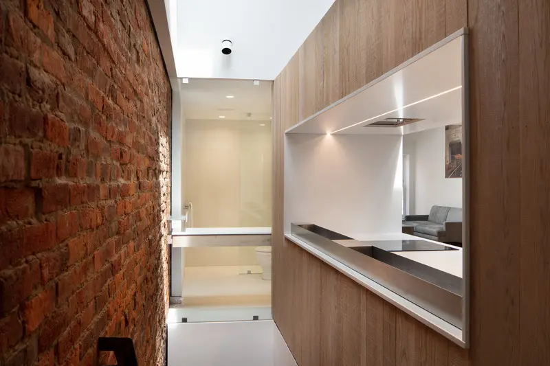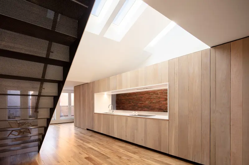 Una abertura similar a una ventana a través del volumen del gabinete de roble enmarca una vista de los muros de carga de mampostería de ladrillo originales que ofrecen un espectacular contrapunto de textura y color. El protector contra salpicaduras está completamente abierto a una escalera que conduce al vestíbulo del apartamento de abajo.