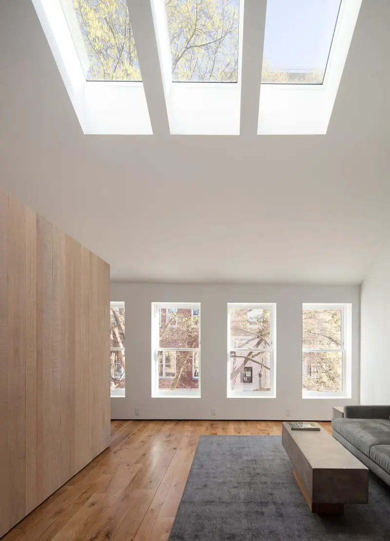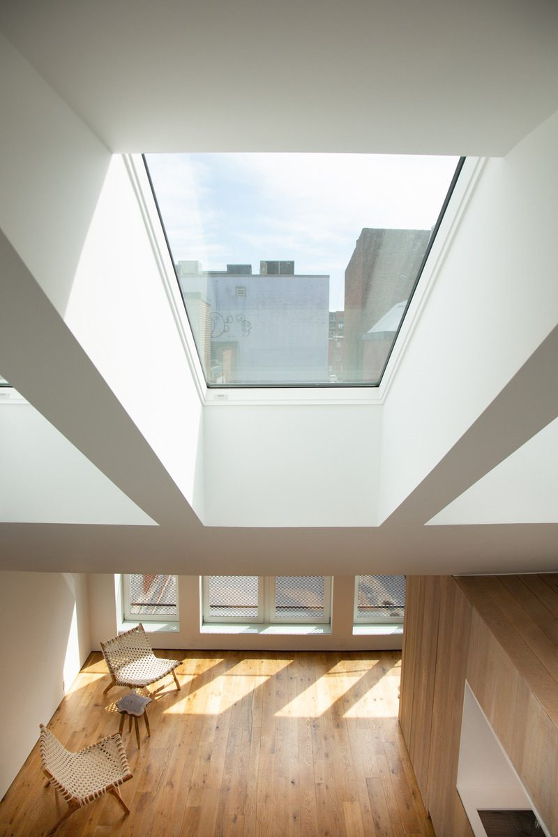 Siete tragaluces nuevos en el techo alto llenan el espacio de luz natural. Las nuevas ventanas revestidas de aluminio de doble panel maximizan las aberturas de luz natural y garantizan un mejor rendimiento energético. El nuevo aislamiento debajo del techo existente proporciona un aislamiento térmico muy superior al valor requerido por el código.