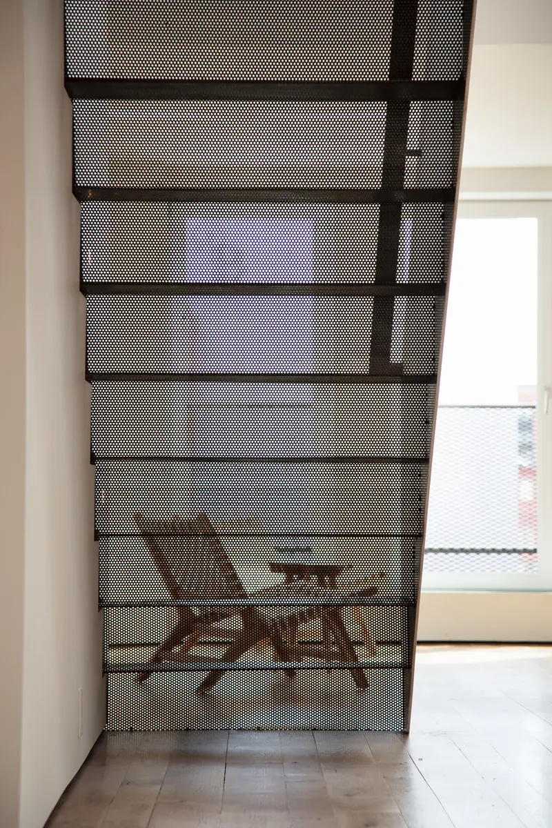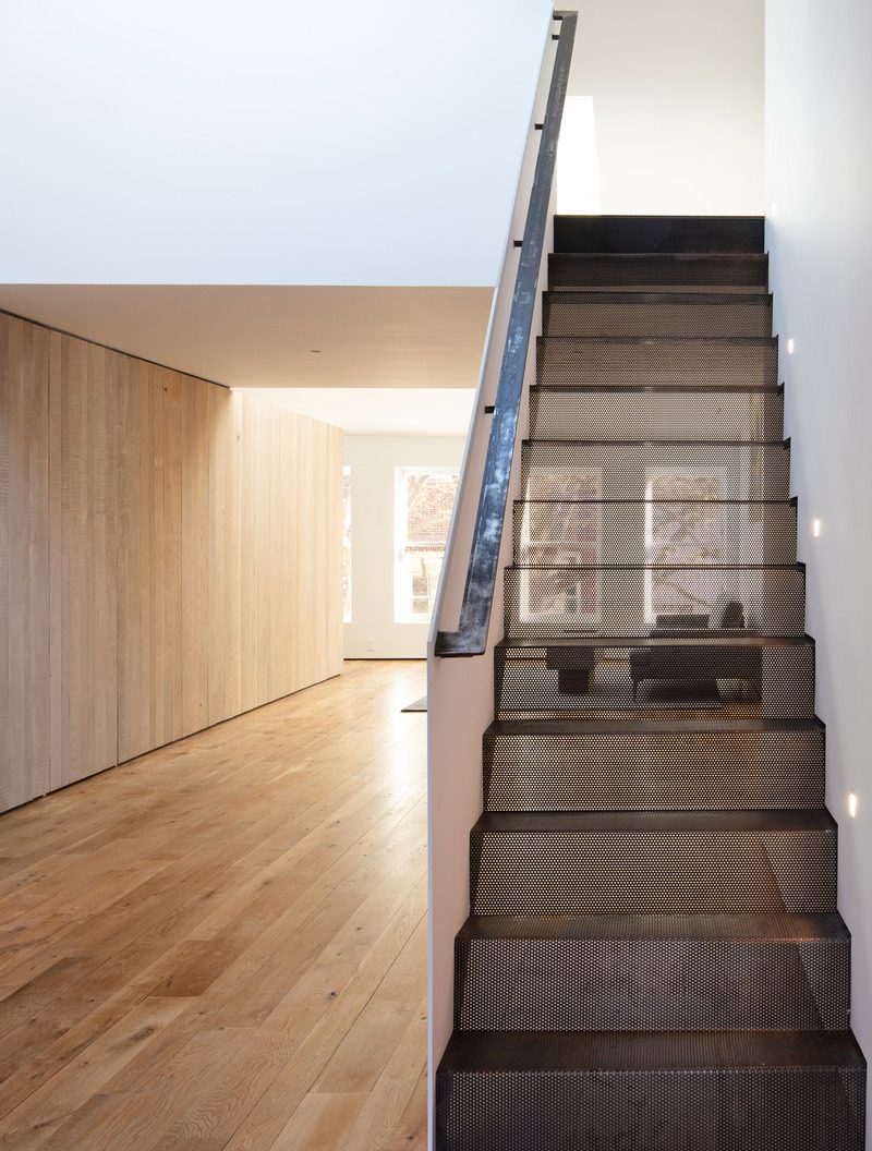 La escalera del desván para dormir es tanto de primer plano como de fondo, pesada y ligera, transparente y opaca. La barandilla blanca es una única placa de acero pintada de 3/8 ”de espesor. Los peldaños y contrahuellas son de acero perforado plegado, fijado a la placa de protección vertical de acero, creando una estructura integrada delicada, pero monolítica.