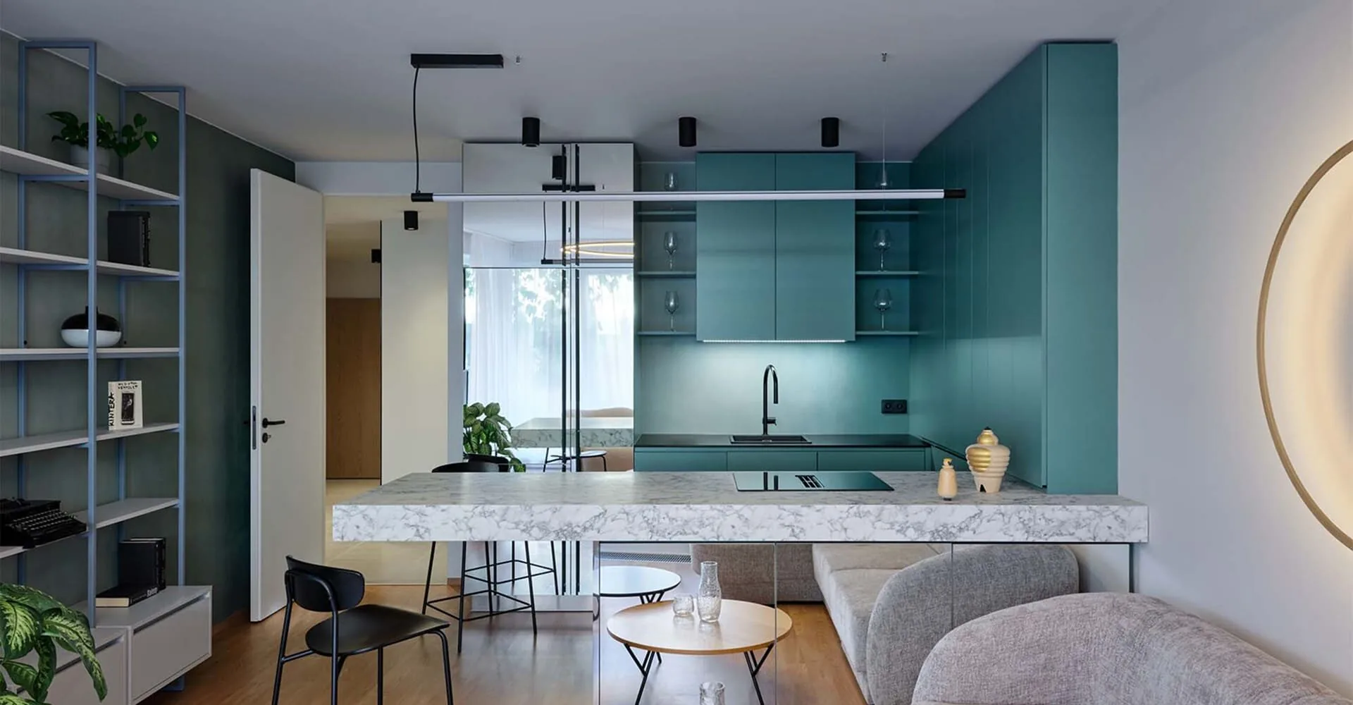 El proyecto de la renovación de este apartamento en Pitkovice, República Checa, creado por la firma Formafatal Studio , transforma el espacio habitable de Kateřina, una joven cliente, en un refugio elegante y sofisticado. Su principal deseo era modernizar, hacer más acogedor y unificar el espacio. Como lectora apasionada, la propietaria también quería incorporar una amplia biblioteca y conservar suficiente vegetación. El concepto de colores y materiales se diseñó para ser fresco, elegante, juvenil y a la vez minimalista. Se prestó especial atención a la distribución funcional de la cocina, con una barra, una elegante biblioteca y un cómodo rincón de lectura. El apartamento ahora cuenta con prácticas soluciones de almacenamiento, optimizadas y hábilmente ocultas para mantener la armonía del espacio. El diseño del lugar es atemporal y atractivo, con tonos claros de azul petróleo y madera natural que se combinan armoniosamente con los modernos acabados de cemento y espejos en las paredes. Además, los elementos más oscuros, como los detalles de iluminación y los taburetes de bar, aportan el contraste visual necesario al interior. Detalles de la renovación del apartamento Una característica destacada del interior es el revestimiento epoxi de las paredes del salón y el baño, que va del gris claro al azul petróleo, a juego con la cocina y la mampara de cristal del baño. El salón se convierte en un oasis gracias a las ventanas francesas que aportan luz natural a través de suaves cortinas que difuminan la luminosidad. Estos textiles dispersan e iluminan el espacio, creando una atmósfera de calma y amplitud. Por otro lado, el baño se ha modernizado priorizando una elegante composición de elementos estéticos y funcionales, así como la ampliación visual del espacio. Asimismo, la sustitución de la pared original por una mampara de cristal (que separa el recibidor del baño) no solo conecta estéticamente los espacios, sino que también los amplía. Esta sensación de amplitud se percibe inmediatamente al entrar en el apartamento. La distribución de la cocina se mantiene fiel al diseño original. El nuevo diseño de este espacio añade funcionalidad al interior e introduce detalles interesantes. La encimera de la isla, con su decoración de mármol, convierte este lugar en un objeto independiente. Su estructura de espejo desaparece de la vista, permitiendo que la zona fluya sin interrupciones. Este proyecto representa una vida moderna que combina eficazmente las necesidades prácticas con un enfoque estético del espacio, reflejando la dinámica y el estilo de la joven cliente. Formafatal Studio ha logrado un delicado equilibrio entre funcionalidad y diseño, cumpliendo con los exigentes requisitos del encargo, como lo confirman los comentarios del cliente.