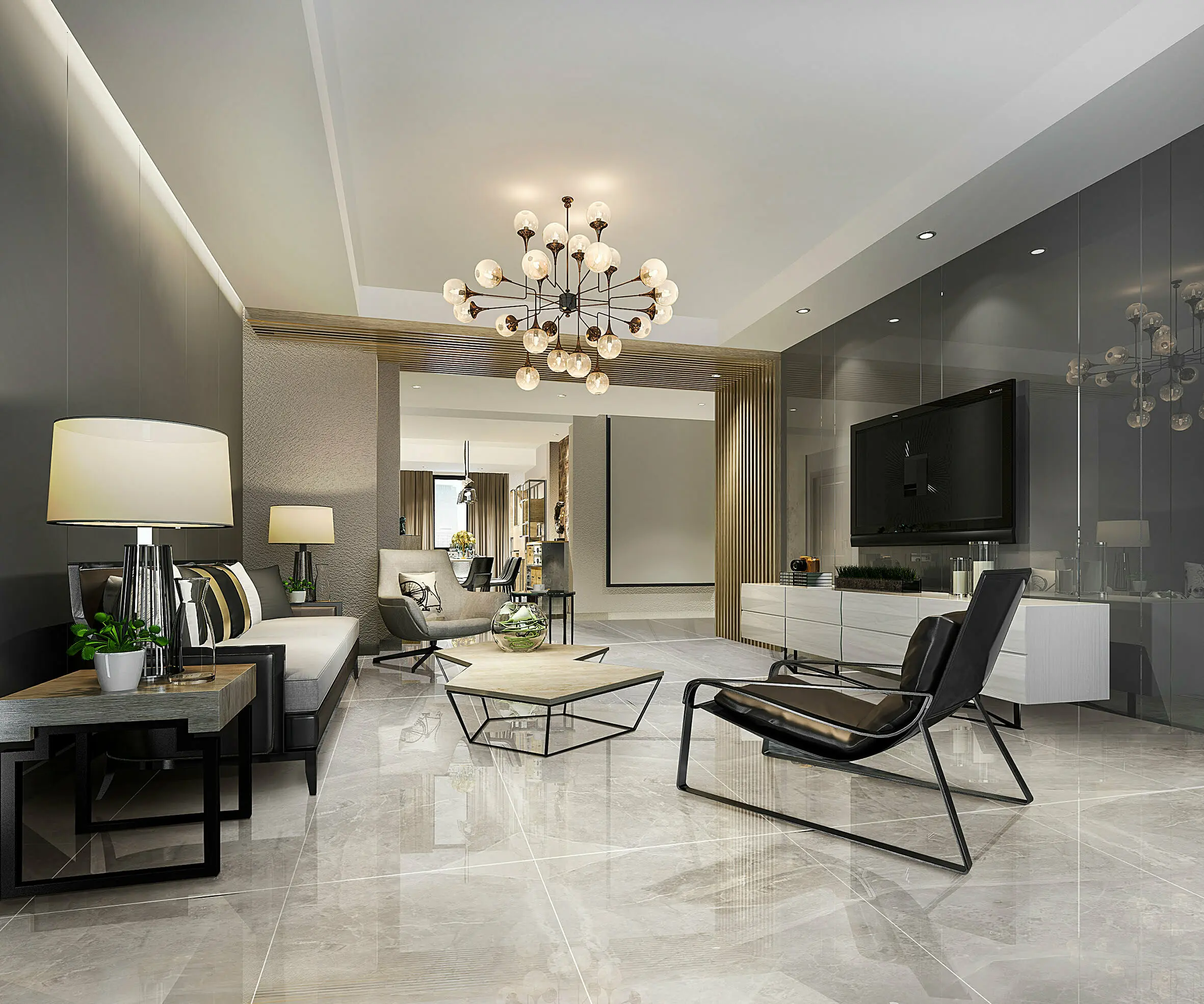 el alabastro, que con sus texturas marmolizadas aporta carácter al ambiente. La tecnología K-Bright logra que este suelo refleje de forma uniforme y con más intensidad la iluminación. Asimismo, genera más contraste, definición en las vetas y sensación de amplitud.
