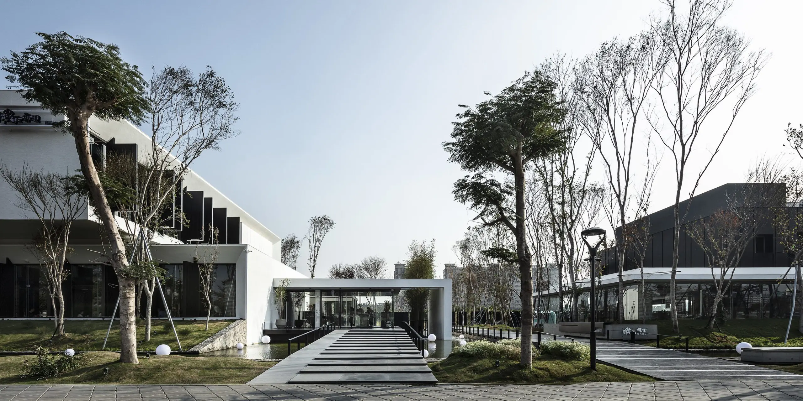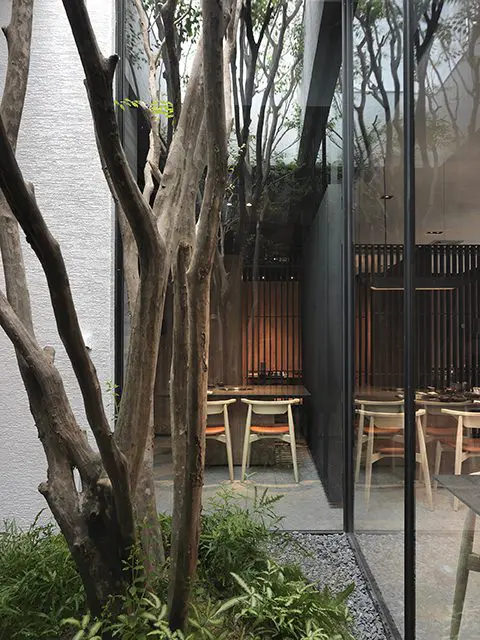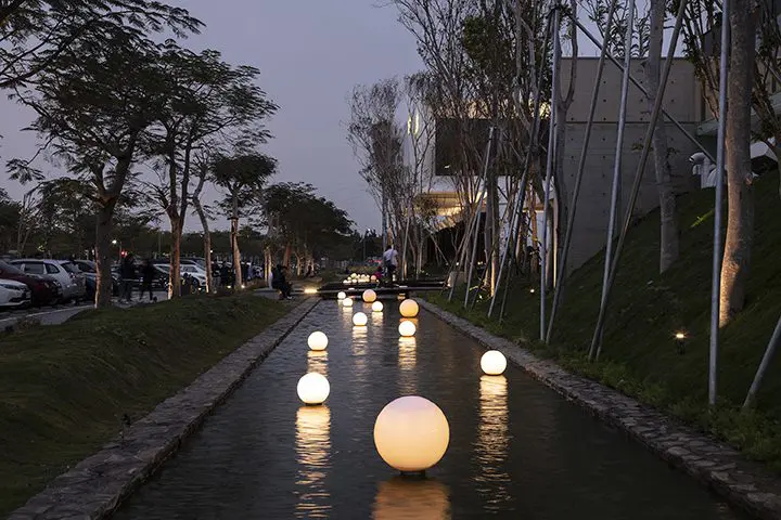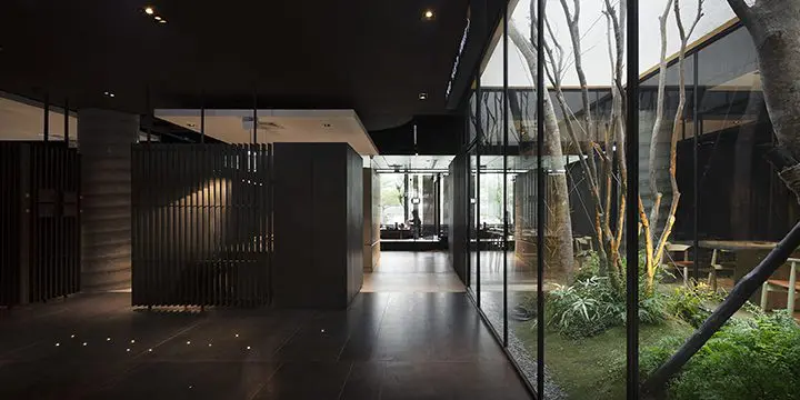 En la entrada principal del restaurante, se colocó un puente sobre la piscina para acentuar el estado de ánimo de los invitados al entrar. La piscina paisajística de casi 120 metros da una fuerte impresión del edificio y crea una conexión entre el edificio y el agua. Alrededor de la propiedad hay más de 250 árboles grandes que reducen las emisiones de carbono del proyecto y crean la sensación de ser transportados a otro lugar.