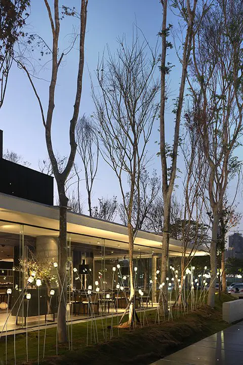 El uso de materiales dentro y fuera del edificio tiene en cuenta el reciclaje y la sostenibilidad, y el uso de materiales como el metal está modularizado. Eso le dará al cliente años de reemplazo eficiente de la mayoría de los componentes. El arboreto de vidrio se coloca en una ubicación central junto con algo de vegetación en la parte superior de una capa de suelo permeable. Además, este espacio también aumenta la posibilidad de que entre luz natural en el interior. Contrastar la fuente de luz artificial con la fuente de luz natural ayuda a difuminar el límite entre el espacio interior y exterior. Esto brinda a los consumidores más oportunidades para disfrutar plenamente de la belleza del entorno natural y la estética de la iluminación artificial interior.