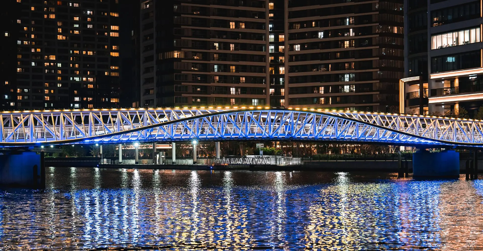 La pasarela Reimei Kobashi, que conecta la estación Kachidoki y Harumi 3-chome en el distrito costero de Tokio, se abrió al público el 25 de marzo de 2024. Esta pasarela cruza el canal Asashio hasta Grand Marina Tokyo, con un diseño arqueado suave que recuerda a las olas que ruedan sobre la superficie del agua.