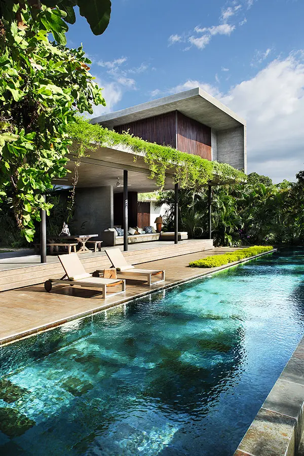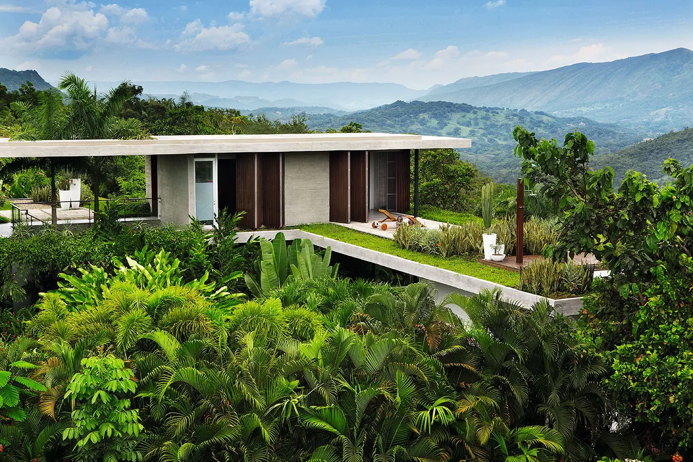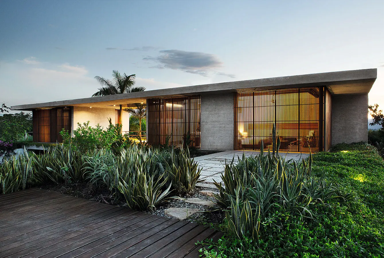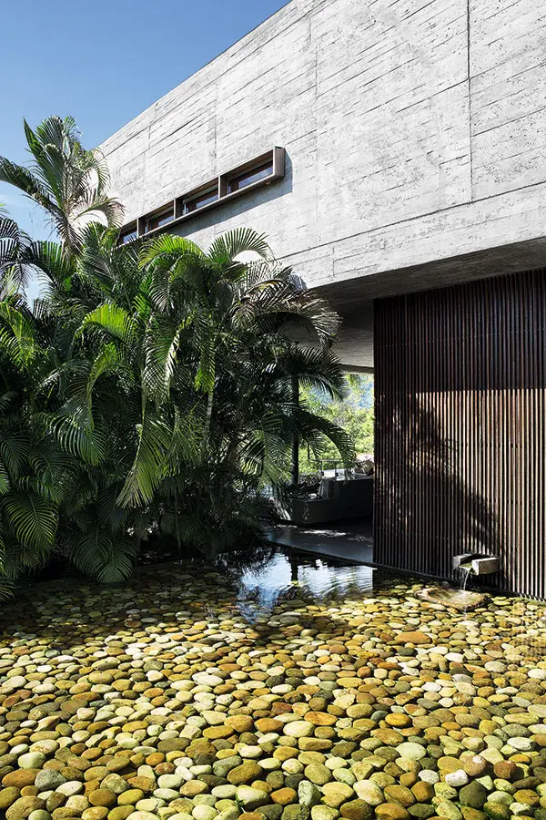 Complementando este material encontramos puertas y celosías de madera, las cuales, combinadas con el verde de los jardines cercanos y el paisaje lejano y con la presencia del agua, generan una atmósfera cálida de evidente carácter tropical.