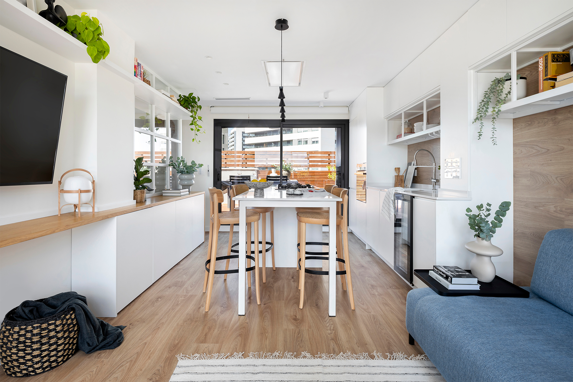 Mientras tanto la armonía estética de la zona de día se nutre del cromatismo del mobiliario blanco y madera con contrastes en negro y sutiles toques de color, como el sofá tapizado en azul.