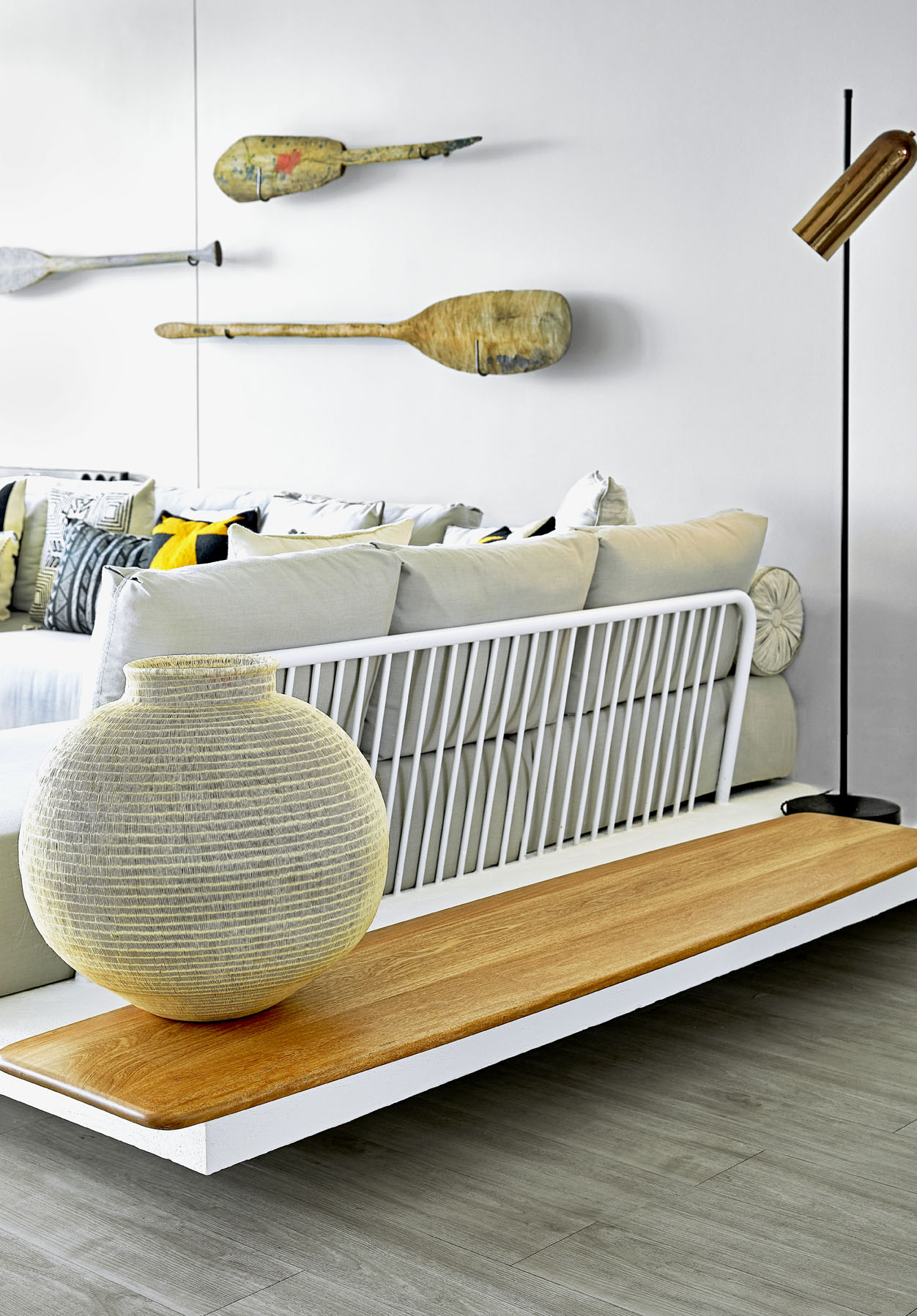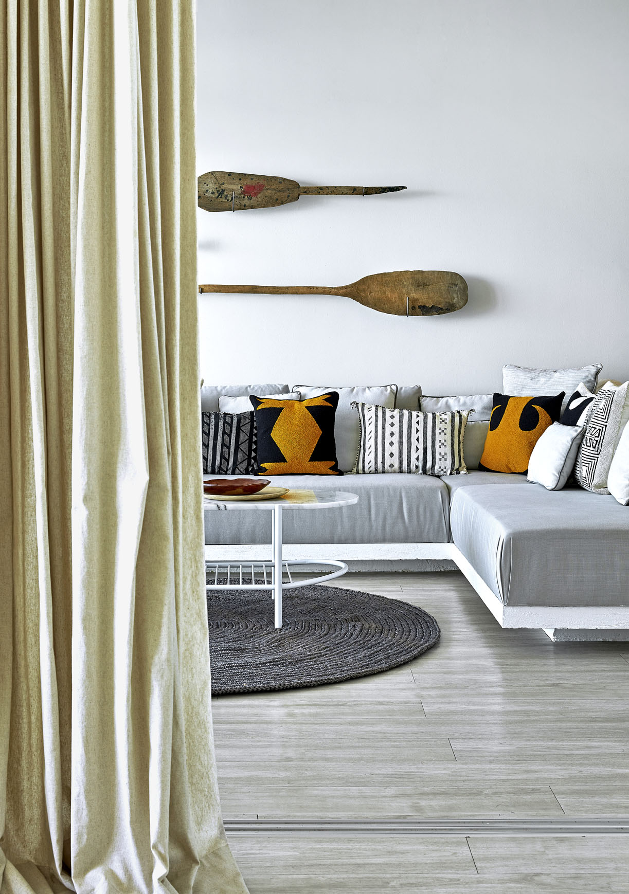 El salón gira en torno al sofá de mampostería y a la mesa de centro Loop, también de Folies. Las telas de la compañía Sunbrella conforman la base del mueble, mientras que el tapete, los cojines y los accesorios, proveídos por Casa Chiqui, expresan sus fibras y texturas al natural. Los remos que adornan la pared de fondo fueron recogidos por pescadores locales: elementos descartados y en desuso, que vinieron a este hogar a ser exaltados y a consolidar un aire autóctono y local.