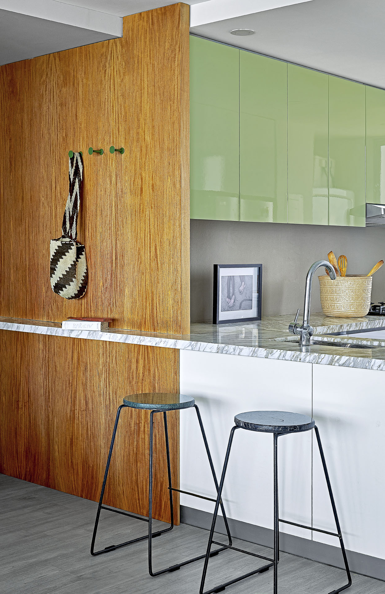 La cocina se abre por completo. El mesón de mármol volakas contrasta con un gran panel de madera de flor morado y con los gabinetes de poliuretano verde suave. “Me encanta el verde, un color tranquilo, neutro; no es empalagoso y combina con facilidad”. Dos butacas ligeras de la firma Diamantina y La Perla dan frente al mesón y permiten sacarle el mayor provecho.