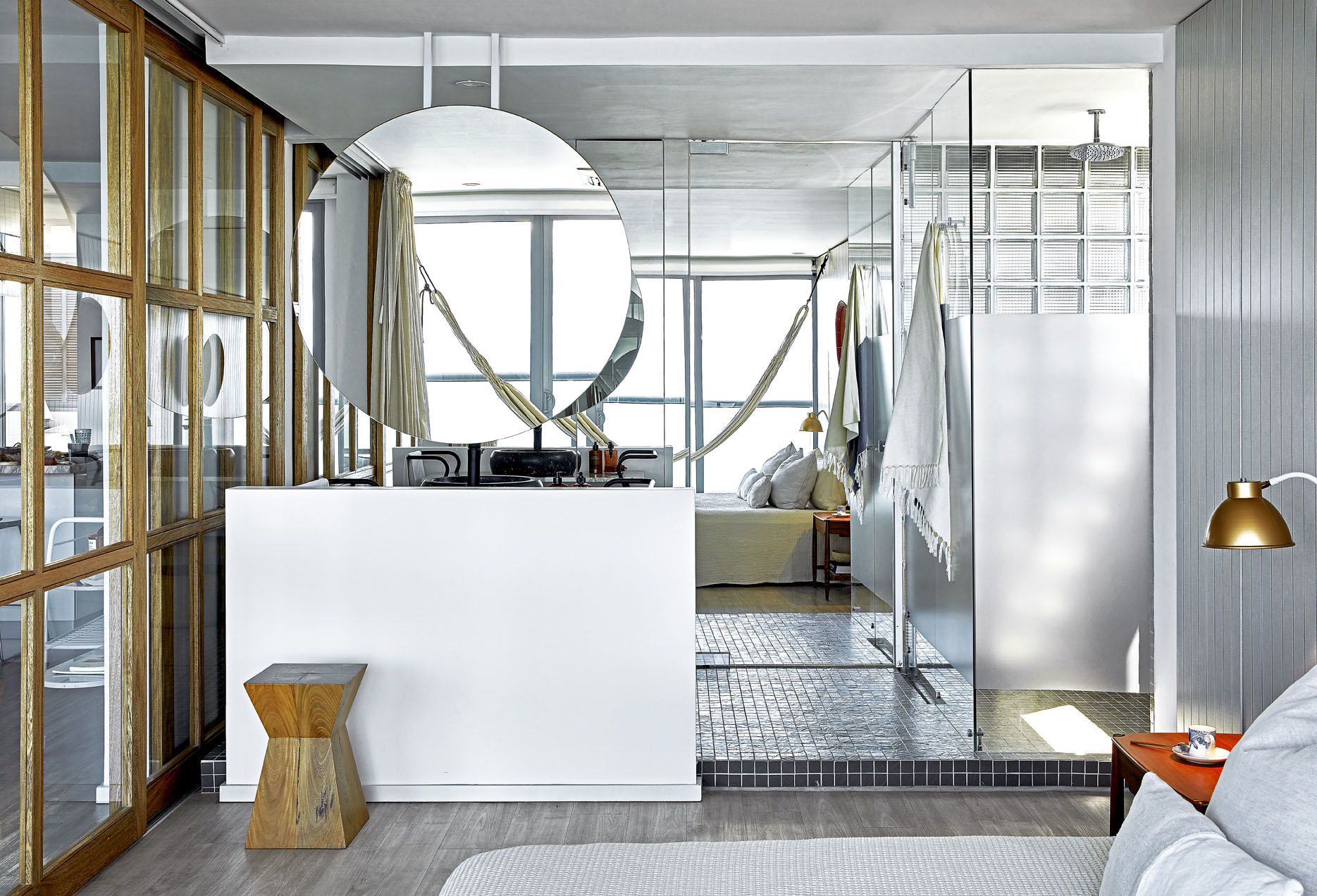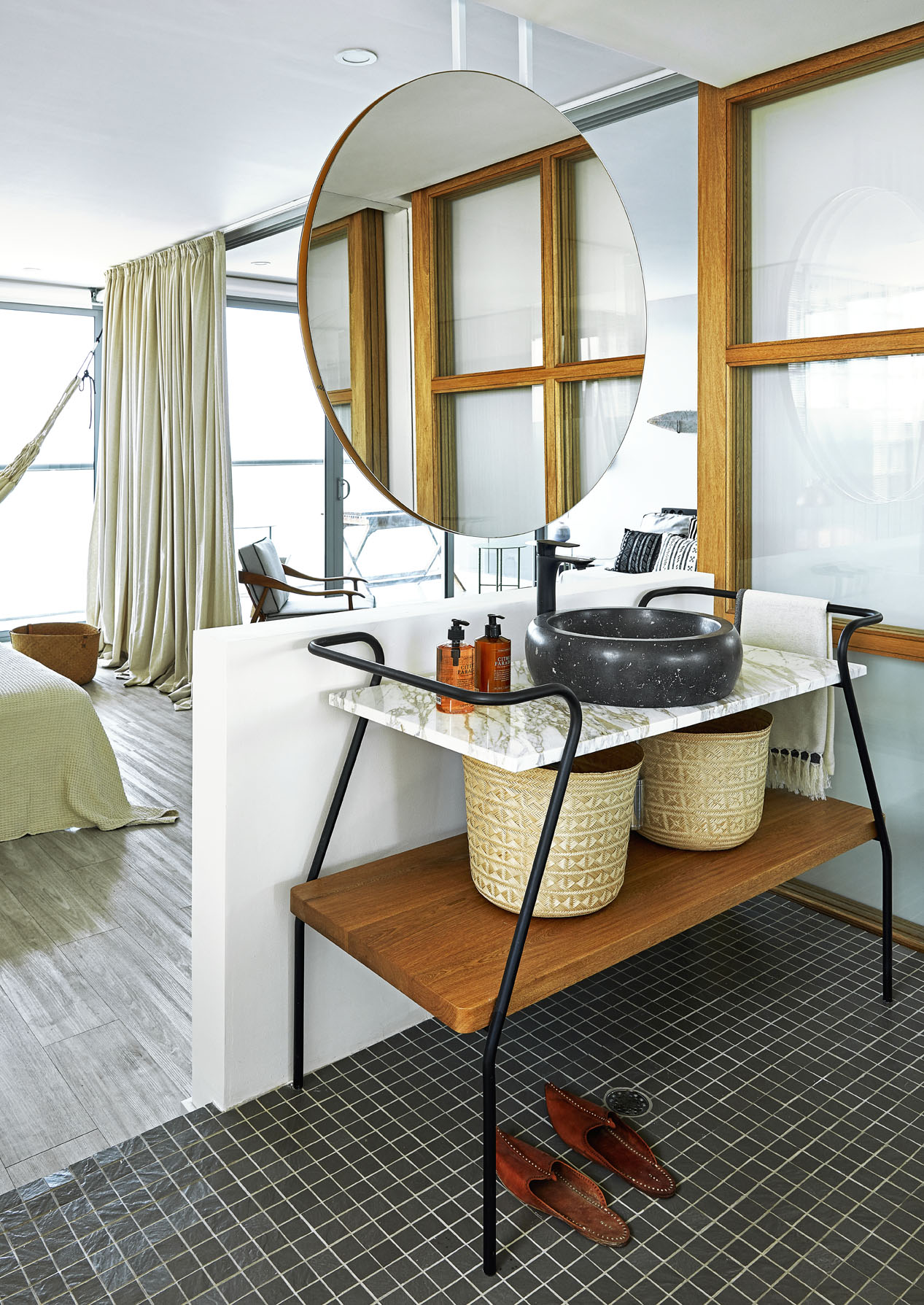 Unido íntimamente con la habitación está el baño. “Queríamos que fuera protagonista, y poder sentir y ver el reflejo del mar desde la ducha”. Por esto evitaron las particiones sólidas y utilizaron mamparas de vidrio y objetos sueltos, estratégicamente ubicados para distribuir las funciones del área. El bar Hasper, de Folies, fue reinterpretado para conformar el mueble del lavamanos, y complementado con un espejo circular suelto ofrece cierto nivel de independencia frente a la alcoba.