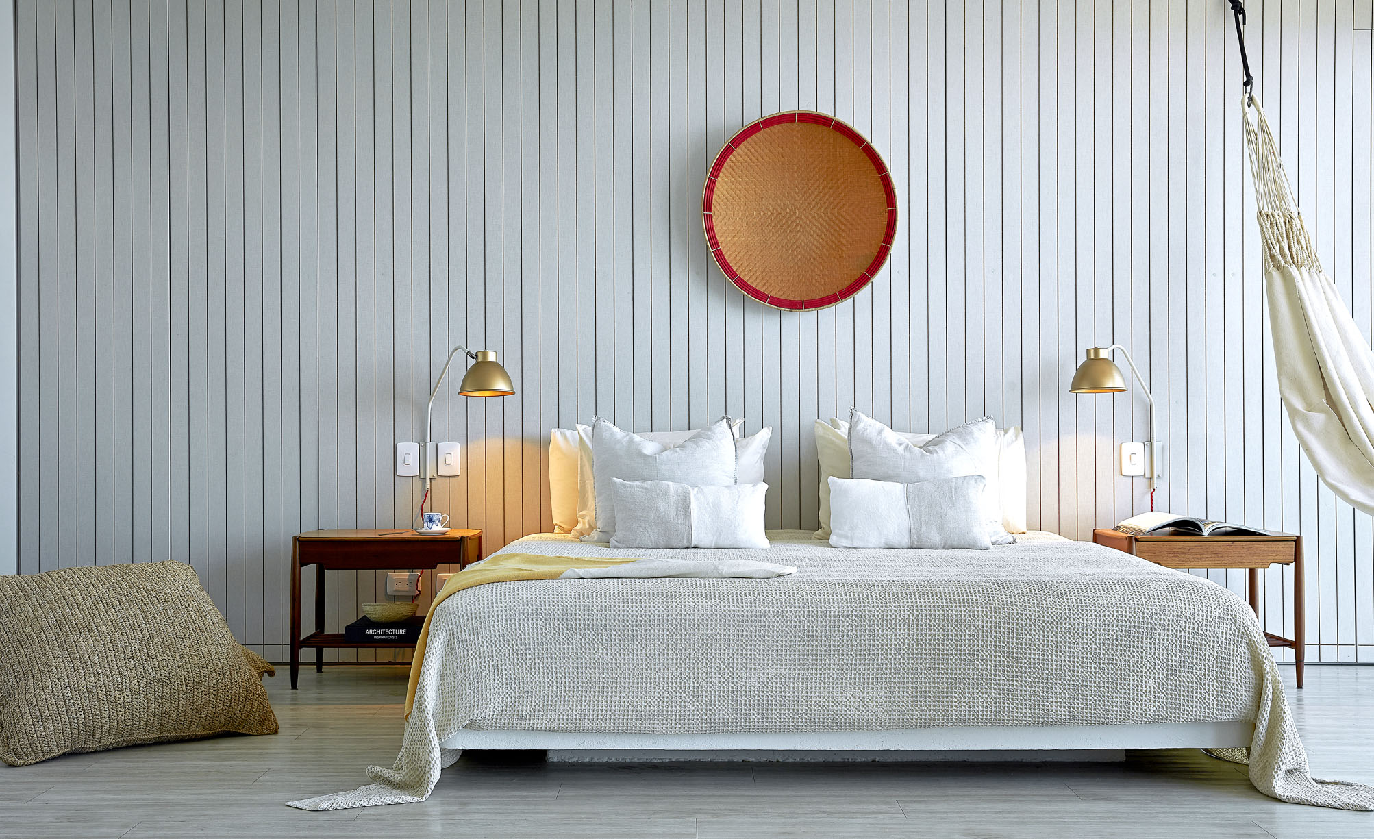La habitación principal, integrada completamente con el salón, se convierte en el corazón del proyecto. El espaldar de la cama, que esconde en su interior el armario principal, está construido a partir de listones de madecor claro, referencia lino. Su color y textura se asemejan al de una tela para reforzar el carácter fresco y natural del ambiente. Un balay de Artesanías de Colombia corona el lugar.