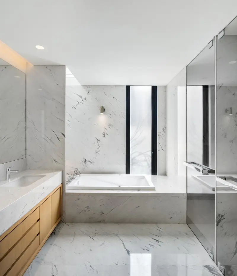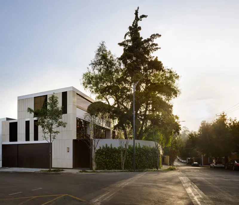 Dentro de su entorno claramente urbano, la sensación de privacidad se logra con éxito gracias a una fachada monolítica y casi ciega que se extiende por la calle, solo interrumpida por algunas aberturas en módulos específicos para fines de iluminación y ventilación, que responden al plan de diseño arquitectónico del interior.