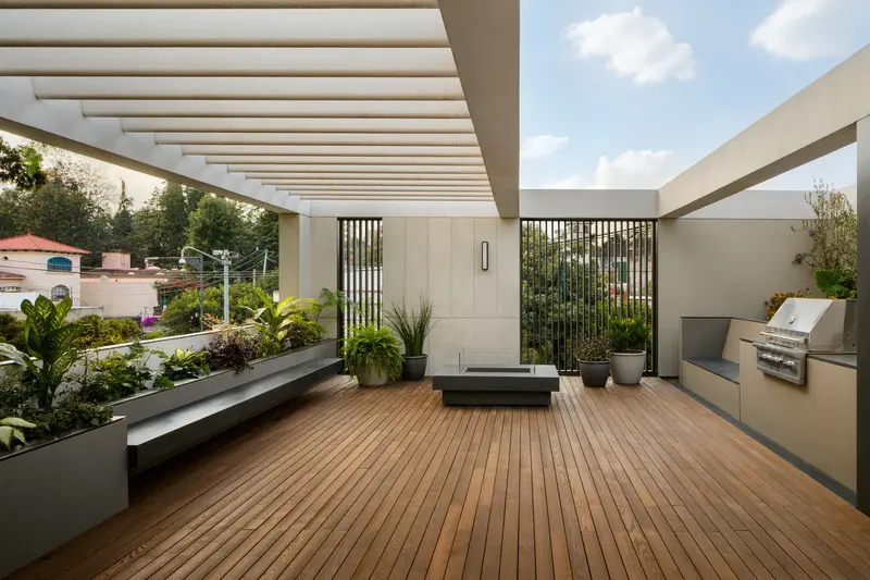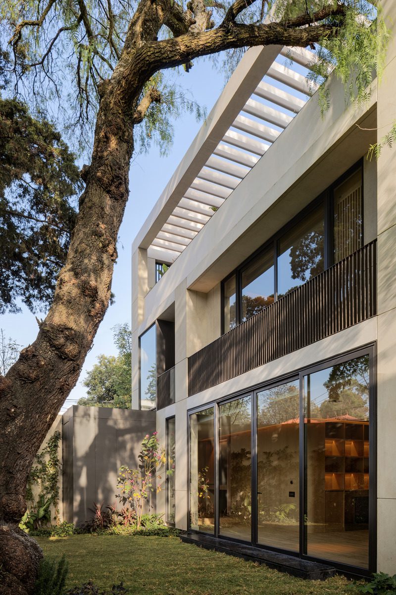 La circulación vertical indica el camino hacia el área familiar y las áreas más privadas de la casa, siempre enmarcadas por vistas al jardín exterior. El segundo piso acomoda la terraza principal, coronada por una pérgola de concreto blanco, a medida que la copa de los árboles se entrelaza y combina con las vigas de la estructura, creando una rejilla de luces y sombras.