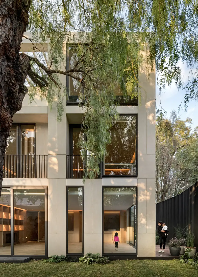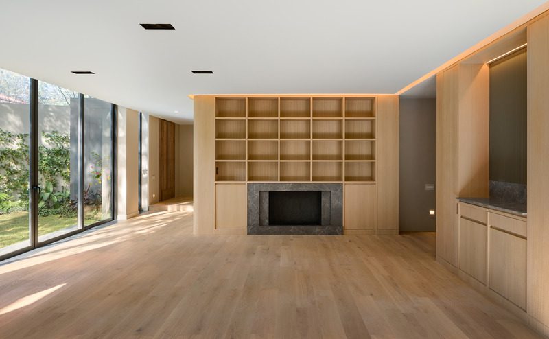En contraste, la fachada sur es más abierta, ofreciendo una vista amplia del jardín y sus árboles de larga data, mientras baña el interior de la casa con luz y proporciona paisajes naturales a cada área habitable.