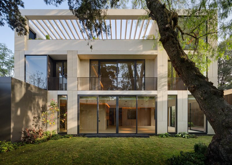 La casa responde a un orden estructural que consiste en base, cuerpo y capital. Su exterior muestra ese orden mediante el uso de elementos estructurales de hormigón blanco expuestos que coronan las aberturas, funcionan como cerramientos y definen claramente los niveles de la casa.