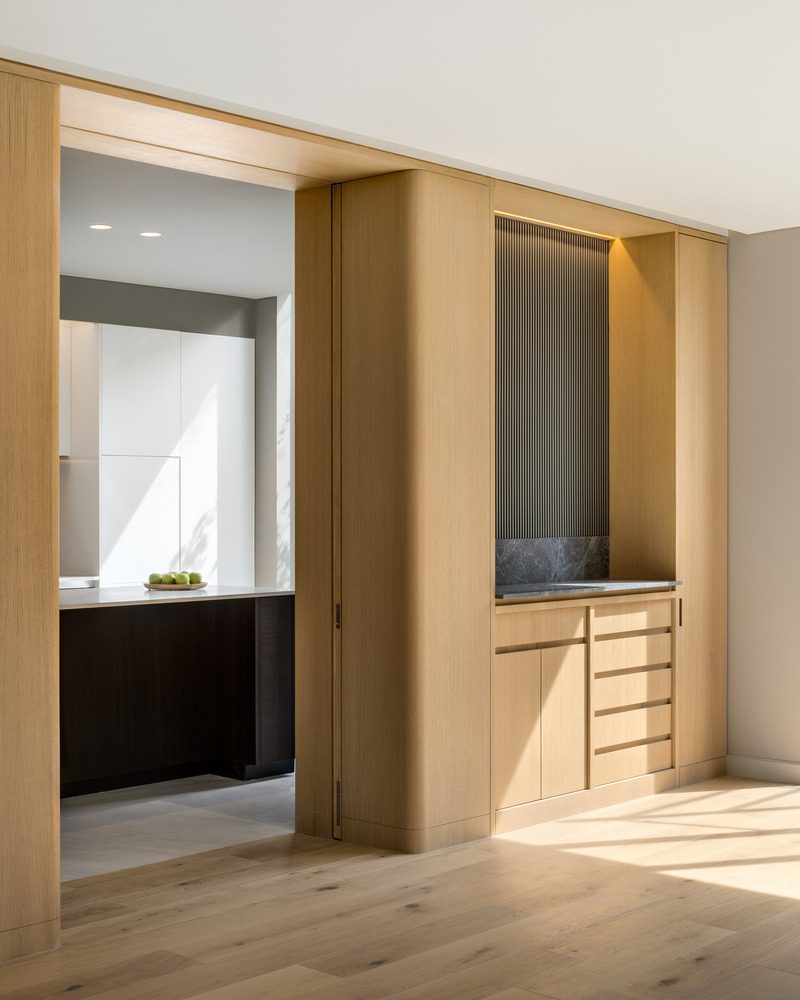 Una paleta de colores neutros en los interiores, junto con la iluminación de fuentes naturales, generan una calidad espacial que promueve una atmósfera tranquila y reafirma el carácter residencial del proyecto.