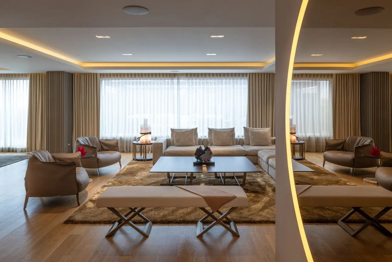 A primera vista llama la atención la monocromía. La decisión de homogeneizar los tonos de los muebles con la pintura de las paredes contribuye a generar una calidad espacial que fomenta el descanso y la relajación. Los matices tierra y la ausencia de contrastes fuertes de color son los elementos estructurantes y unificadores del proyecto a escala visual. El color aquí es un material de constitución del espacio. El diseño de la iluminación, hecho de la mano con la compañía Delta Light, es otro determinante. El uso recurrente de luminarias indirectas escondidas en los cielos falsos, complementadas con otras directas, genera una luz cálida, equilibrada, funcional y uniforme.