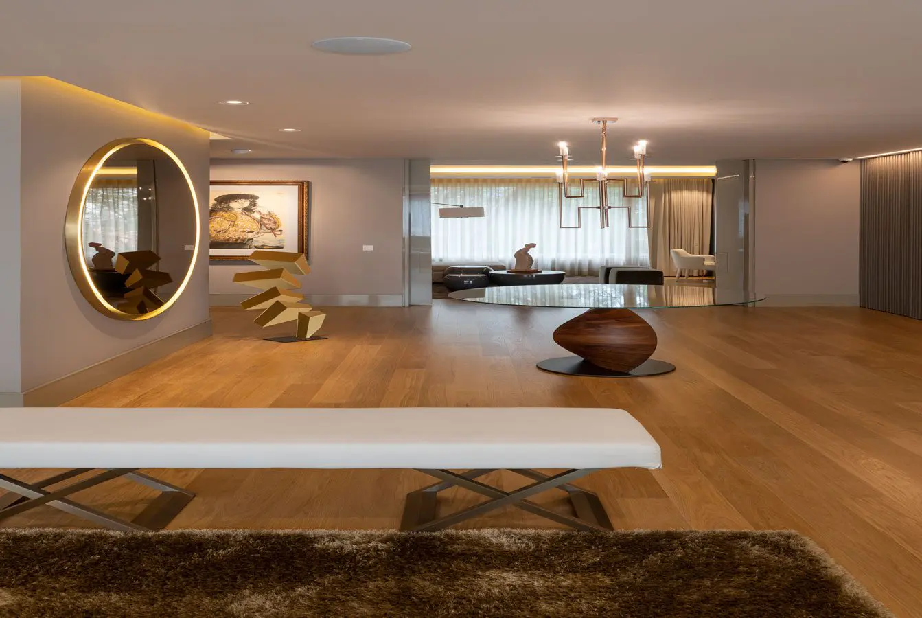 La selección de los muebles privilegia diseños de líneas sencillas. Sofás, mesas, alfombras y sillas proveen al apartamento de superficies blandas que sugieren confort. Cada estancia está concebida para la permanencia y el disfrute del espacio doméstico. La empresa española de decoración Gunni & Trentino se encargó de proveer el mobiliario europeo para el proyecto, con marcas como Casa Milano, Fendi y Poltrona Frau, entre otras. El piso de madera natural a poro abierto, rescatado de la vivienda original, recorre los ambientes y proporciona un fondo constante para los objetos.