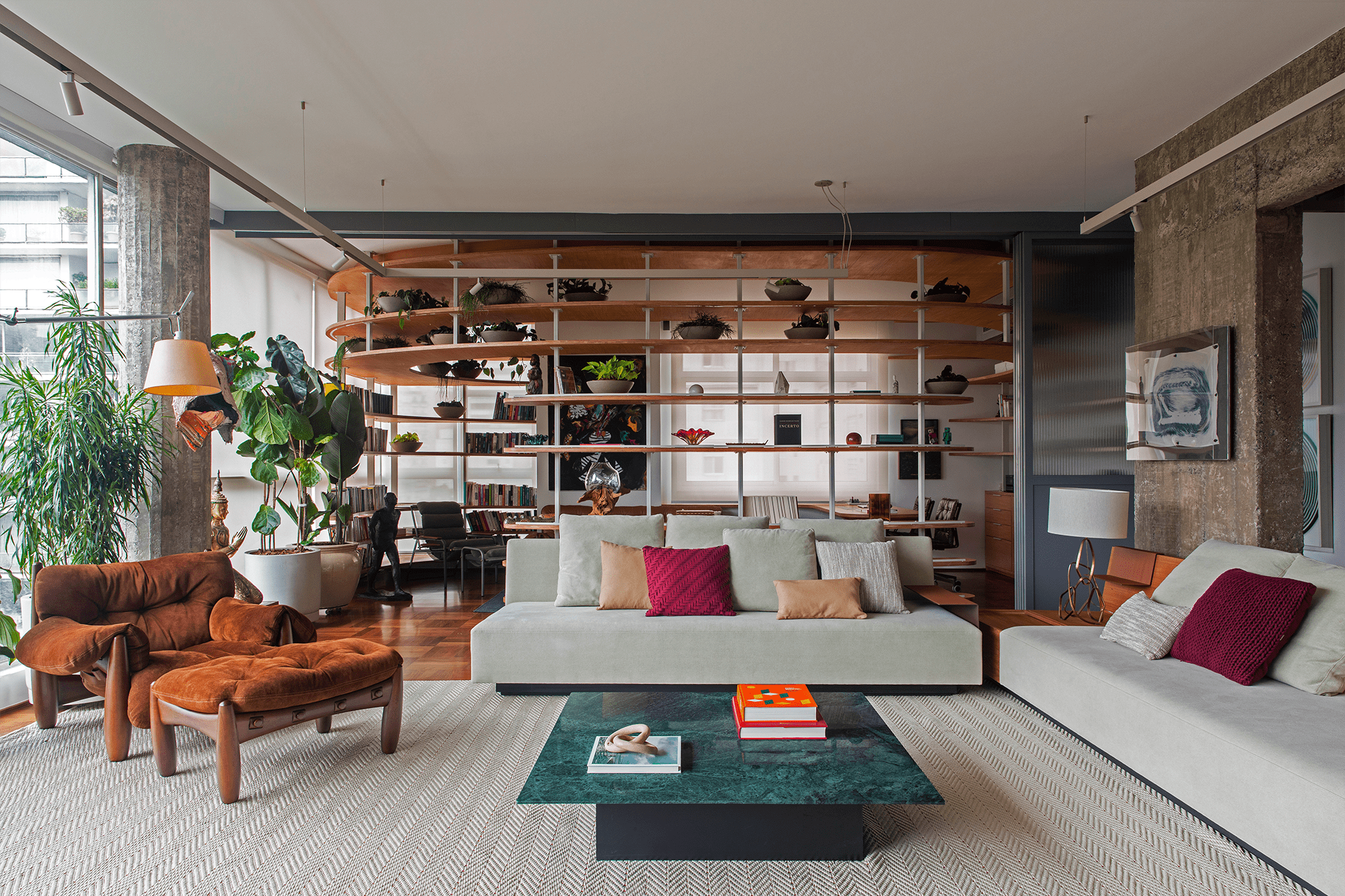 Las ventanas son generosas en todo el perímetro del apartamento y traen a la vida cotidiana la vista arbolada del parque Buenos Aires. En un extremo del salón, la carpintería creada por el equipo de diseño de Superlimão define uno de los principales requerimientos de los clientes: una oficina, donde el propietario trabaja, celebra reuniones y lee libros de su colección. Las puertas correderas, con cierre de cristal acanalado, permiten aislar el espacio o integrarlo al área social.