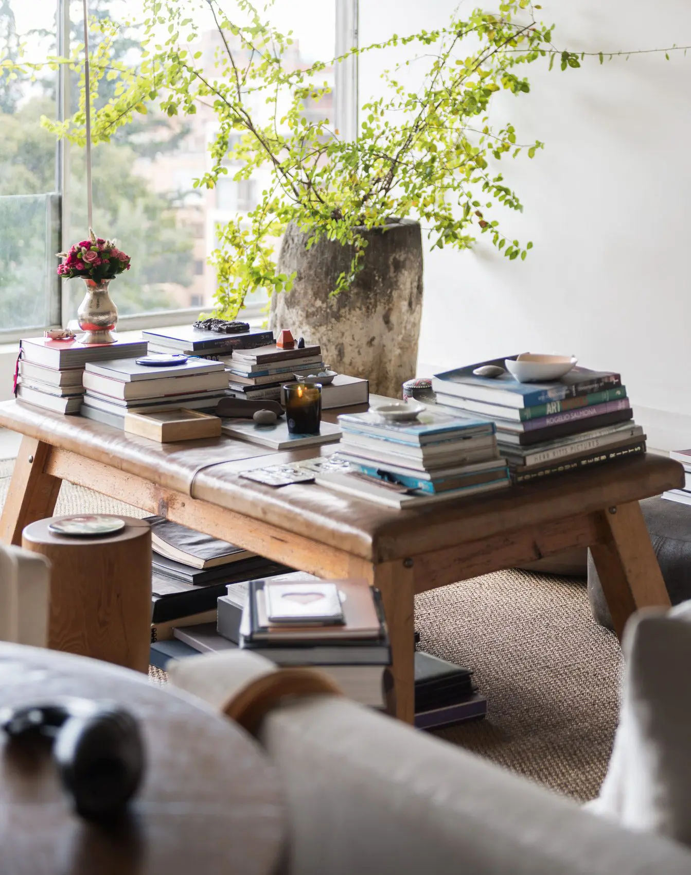 Por su parte, el mesón del comedor, de origen asiático, fue hallado en una tienda en Los Ángeles. La mesa de centro del salón, otrora para masajes, se adecuó cortándole las patas para que adoptara su nueva función.